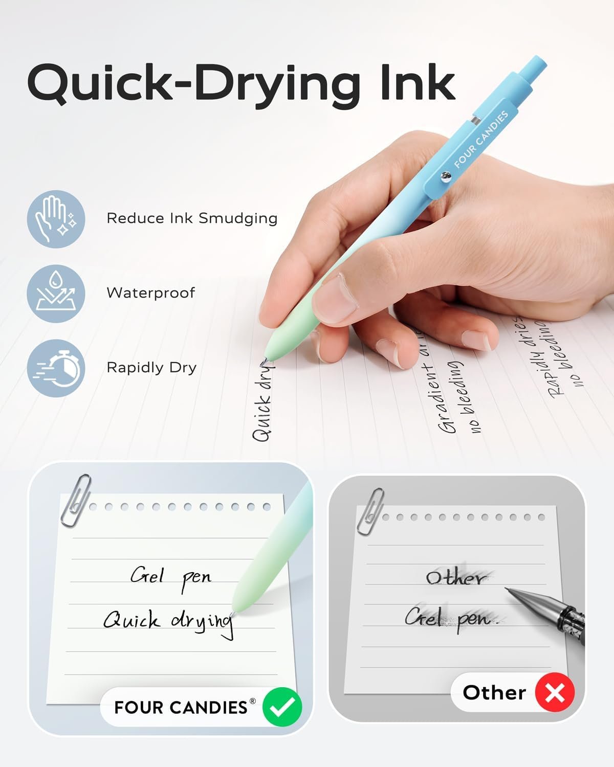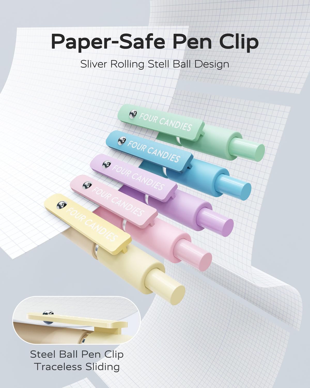 [ Soft Grip & Multi-function Clip ]: You will receive 5pcs quick-drying ink pens with a modern minimalist design to suit your needs Daily use and replacement needs. You can clip the ballpoint pens to the book,bag,binder,or pocket easily, which is convenient to carry and prevents loss.Super soft silicone features grip bring a super soft touch feeling which makes each Four Candies gel pen easy and comfortable to hold.