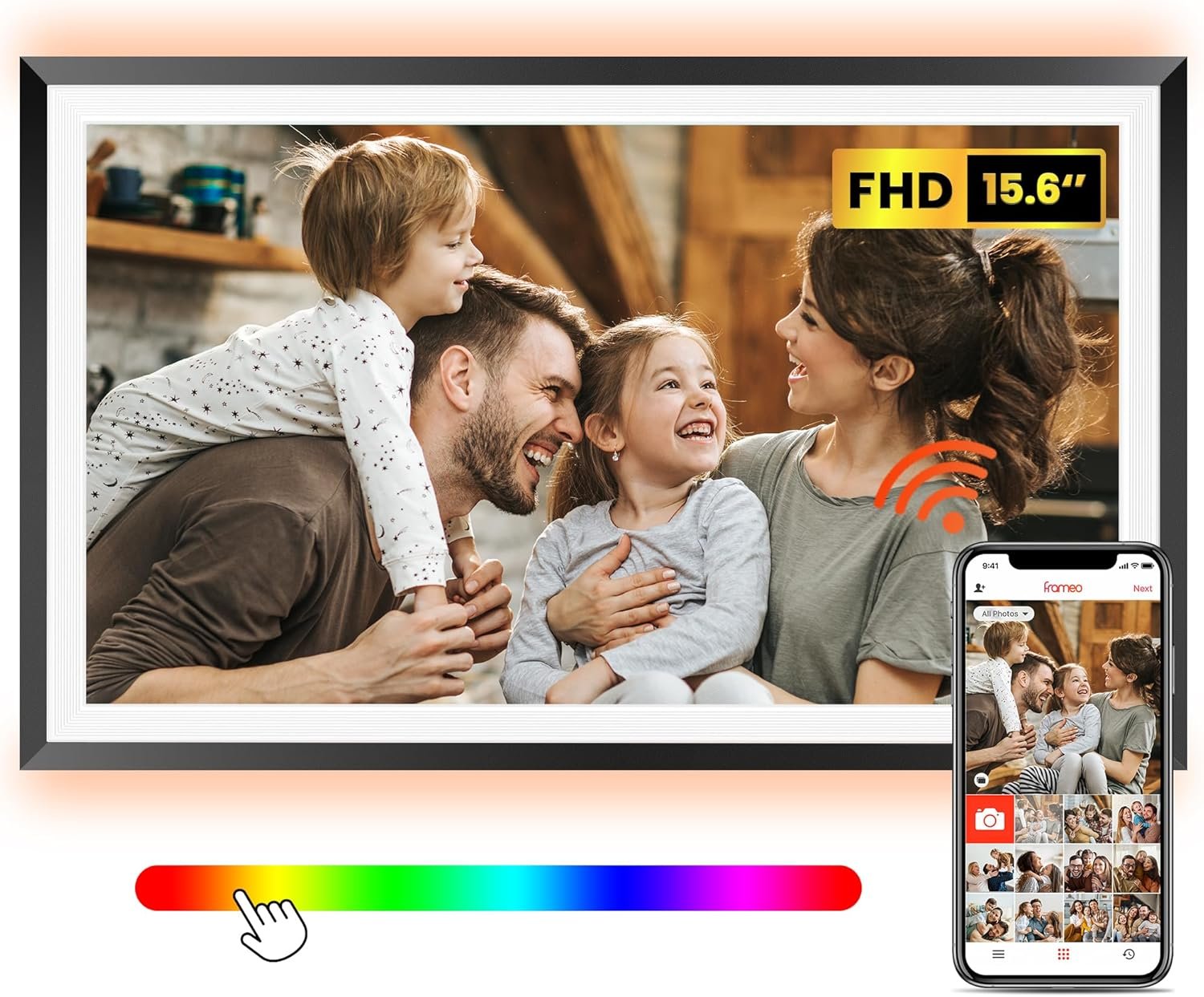Frameo 15.6″ Large Digital Picture Frame with LED Light 1920 x 1080 IPS FHD Touch Screen WiFi Electronic Photo Frame 32GB Memory Auto-Rotate Slideshow Wall-Mounted Share Photos/Video Remotely Anywhere