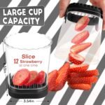 Exclusive Design:【No Food Stuck】The fruit slicer cutter cup comes with a bottom base to push out any excess stuck food when finishing cutting. 【Large-Capacity Cup】Visually larger-capacity cup slicer can slice multiple strawberries at one time, and can be in direct contact with food, healthy and environmentally friendly.