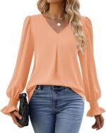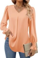 Funlingo Women’s 2024 Long Sleeve Tops Dressy Casual V Neck Tunic Shirts Loose Chiffon Work Blouse
