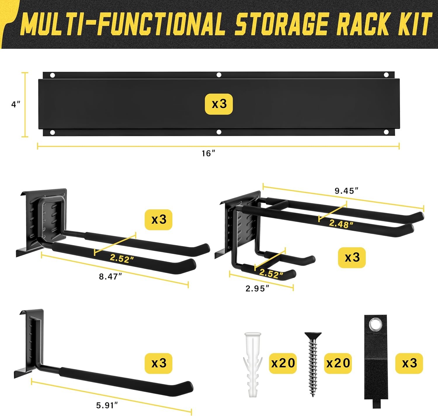 IMPROVED DESIGN:Yard Tool Organizer for Garage.Double Upper Hooks:Wider Spacing to 2.48 inches.Double Lower Hooks:Wider Spacing to 2.52inches.Fulfills More Hanging Needs.Equipped With 9 Hooks(3 Double-Layer Hooks,3 Single Level,3 Small Hook,3 Nylon Taping) and 3 Rails.