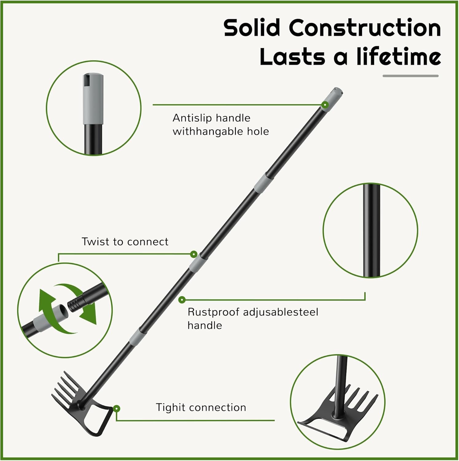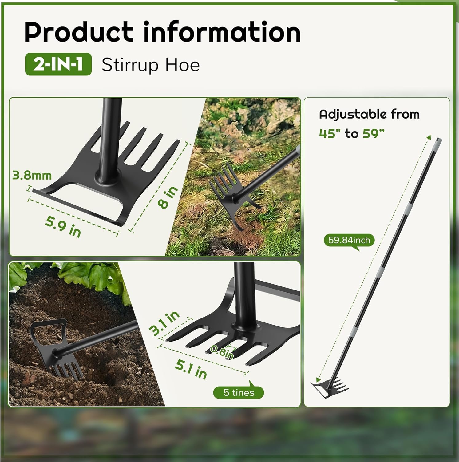 【Adjustable and Ergonomic for Maximum Comfort】Crafted from heavy-duty steel, the adjustable handle extends from 45 to 59 inches, accommodating users of different heights and various gardening tasks. With a 1 1/8-inch rod diameter, this hoe is strong enough for heavy-duty work. The handle features a non-slip rubber grip for added comfort, making your Hoe Garden experience as smooth as possible.