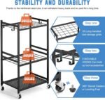 【INNOVATIVE GARAGE ORGANIZATION】: The garden tool organizer comes with 4 universal wheels that smoothly move through thick grass and can easily be moved from indoors to outdoors. It efficiently organizes space in your garage and shed when used indoors, with built-in brakes on the front 2 casters to keep the tool holder in position and add stability. It is also equipped with leveling feet,it is also suitable for uneven ground.