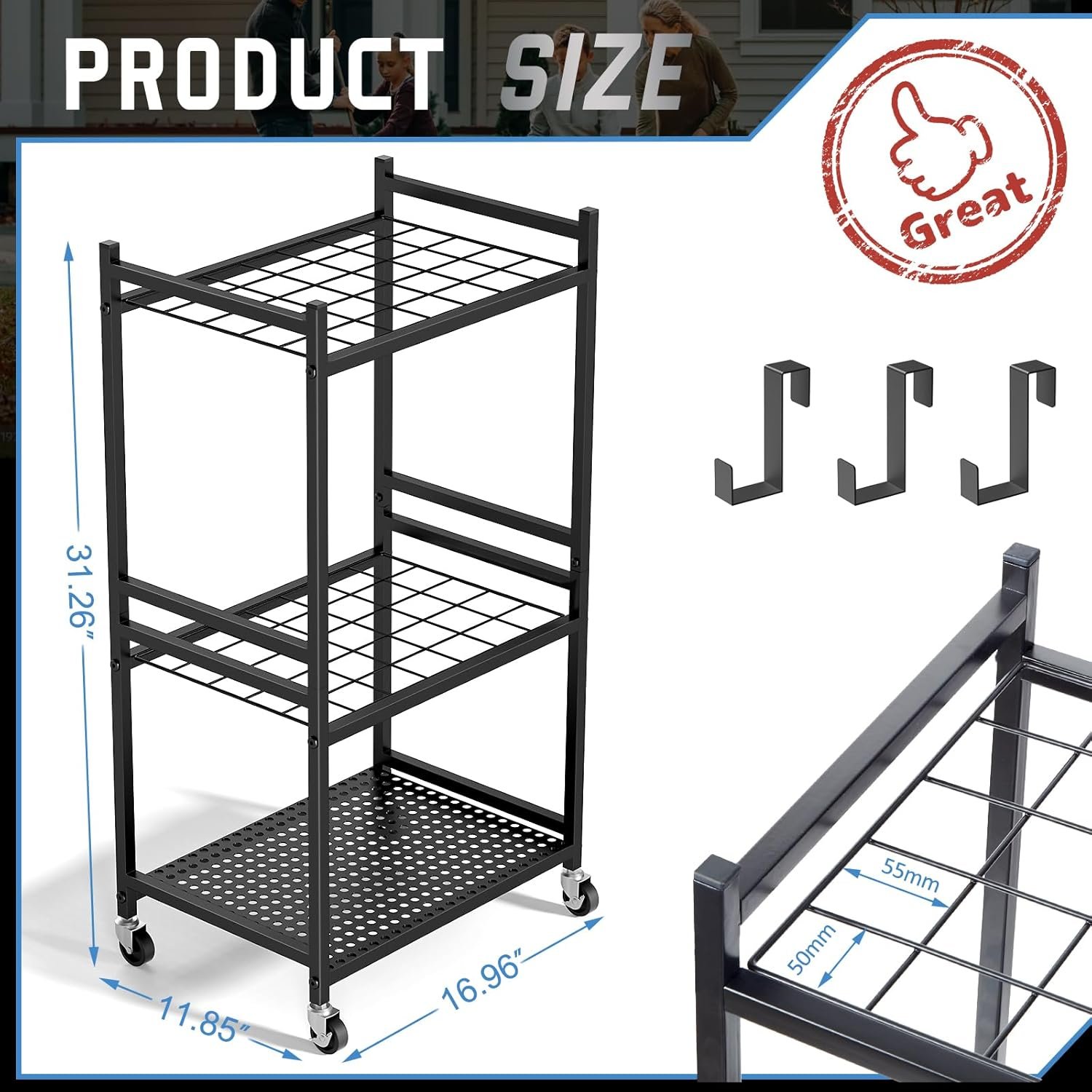 Garden Tool Organizer with Wheels, Yard Tool Tower rack for Garage Organization and Storage, Up to 35 Long-Handled Tools, Sturdy Metal Steel Tool Holder with 3 Hooks, Outdoor, Black