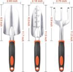 [Sturdy and Long lasting]: The main body of our garden tools set is made with high-quality thickened aluminum alloy material, which is rust-resistant, long lasting and extremely sturdy. Would not easily break even when dealing with thick roots or rocky soil.