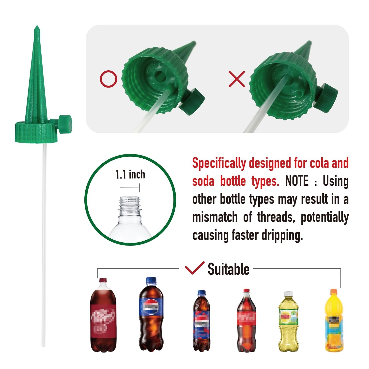 【Widely Compatible】Compatible with most 【COLA】 and 【SODA】 bottles on the market (excluding mineral water bottles), these self-watering spikes offer versatility. Please NOTE that using other bottles may result in LEAKAGE due to thread incompatibility