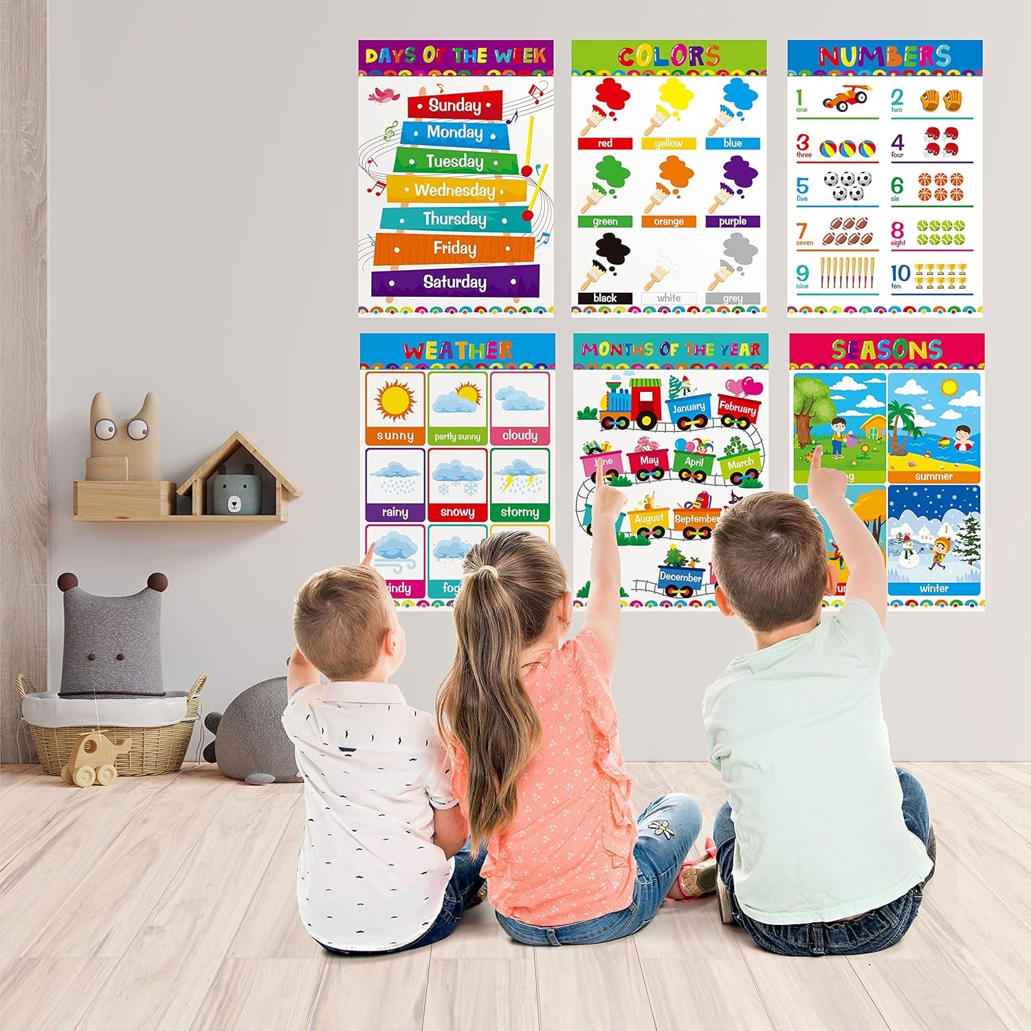 Early Education: 17 posters including alphabet, 1-10 and 1-100 numbers, time, shapes, week, seasons, months, emotions, weather, money, colors, opposites, five senses, math, solar system and farm animals. The wide-ranging contents meet early educational needs greatly, bright and vivid graphics to attract children’s attention.