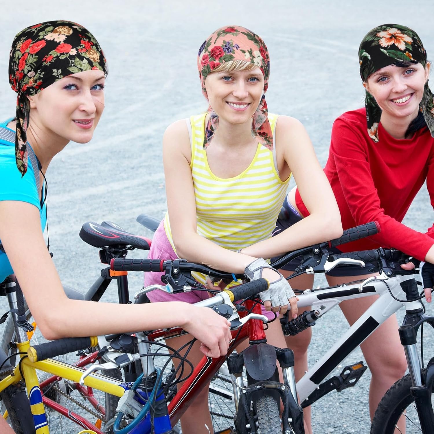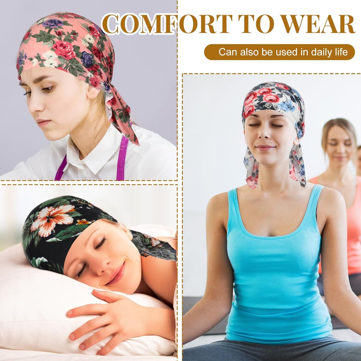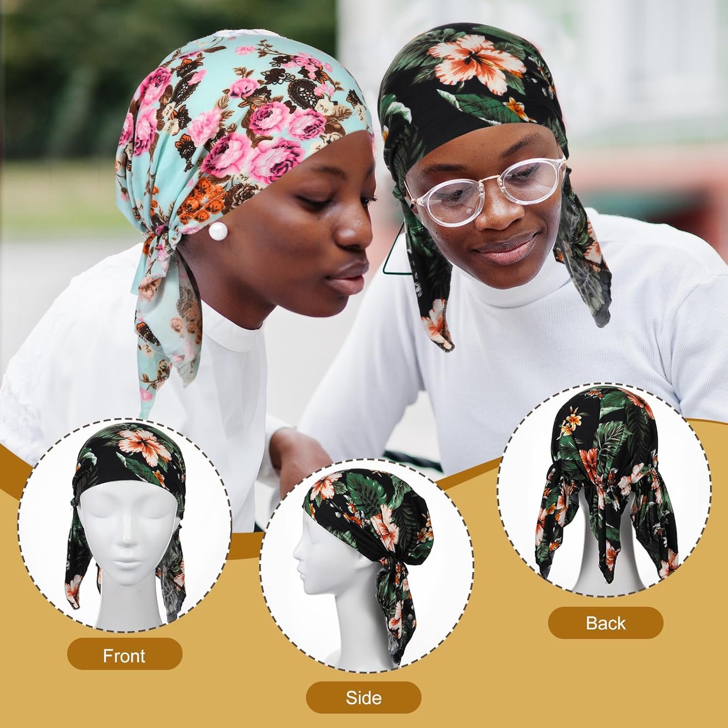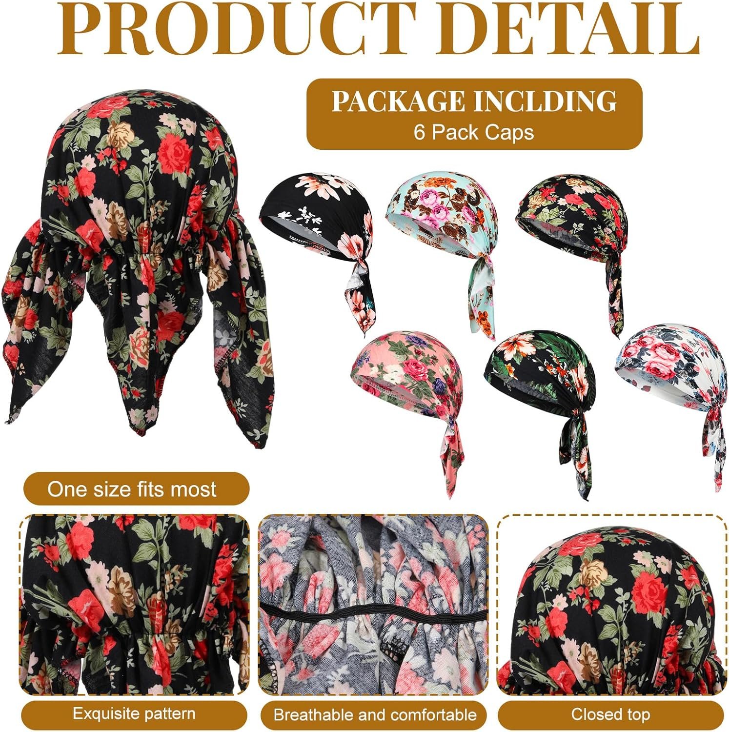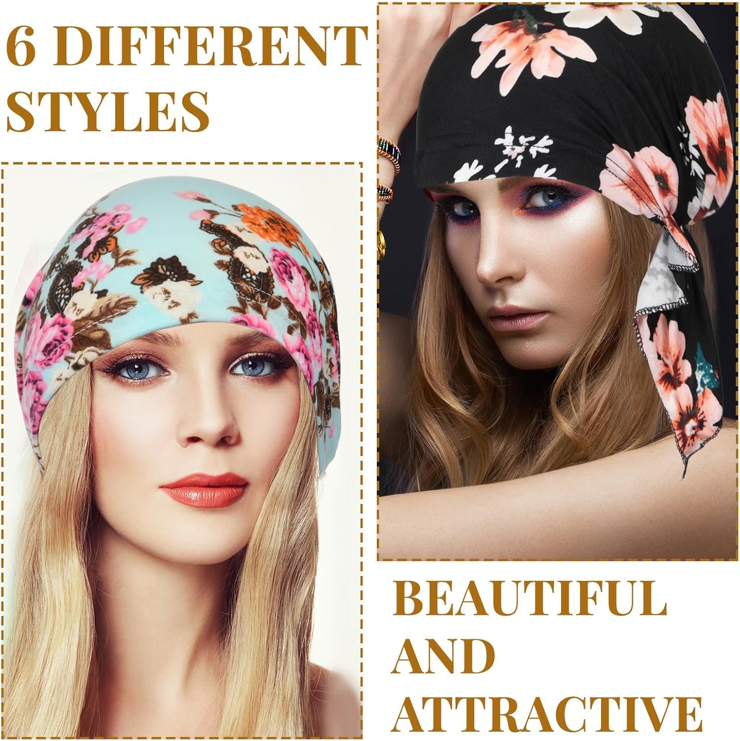 Geyoga 6 Pcs Women Head Scarf Pre-Tied Head Scarves Beanies Covers Cap Stretch Print Sleep Turban Hat Ruffle Beanie Scarf