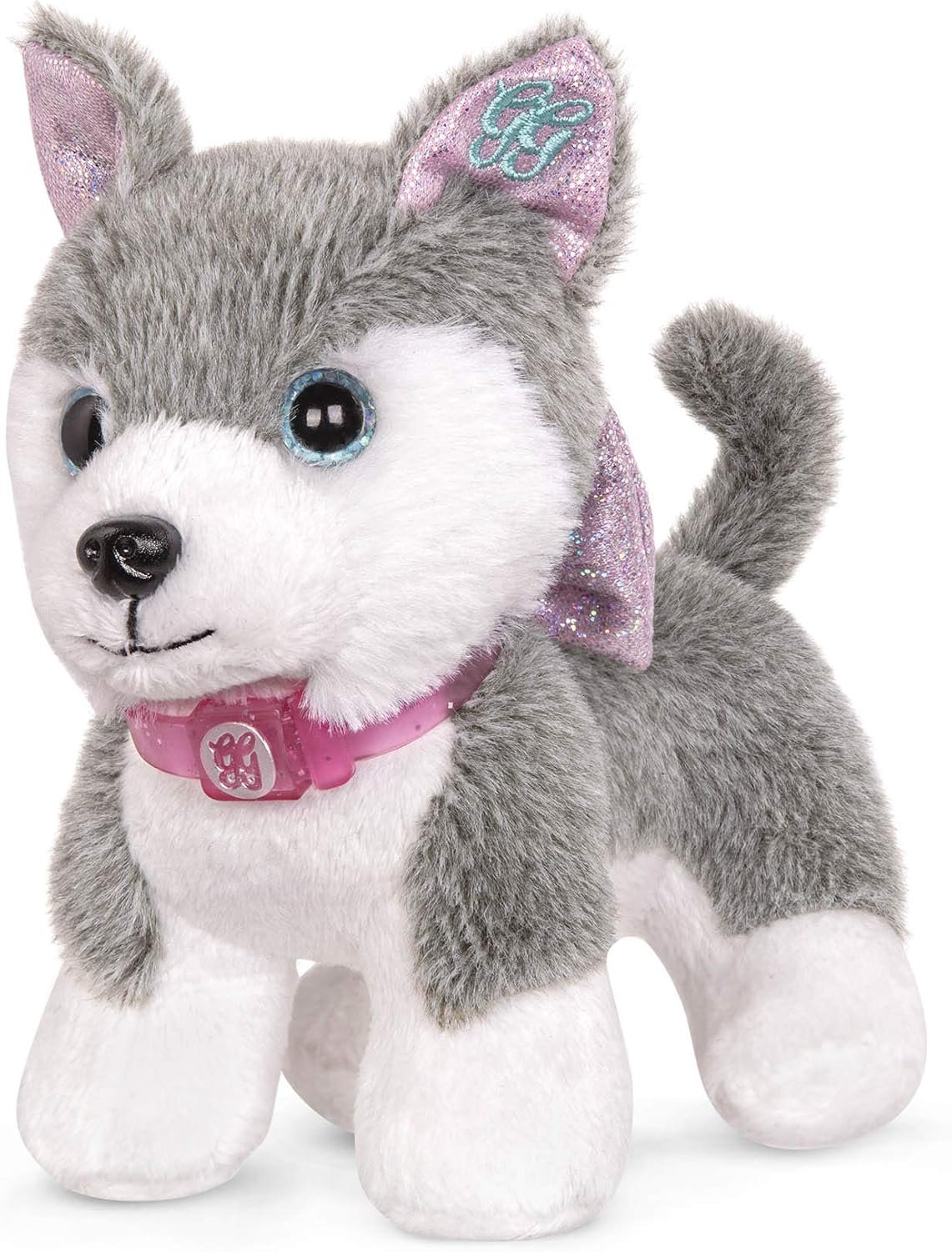 Includes: (1) plush toy dog and (1) collar with attached glitter bow