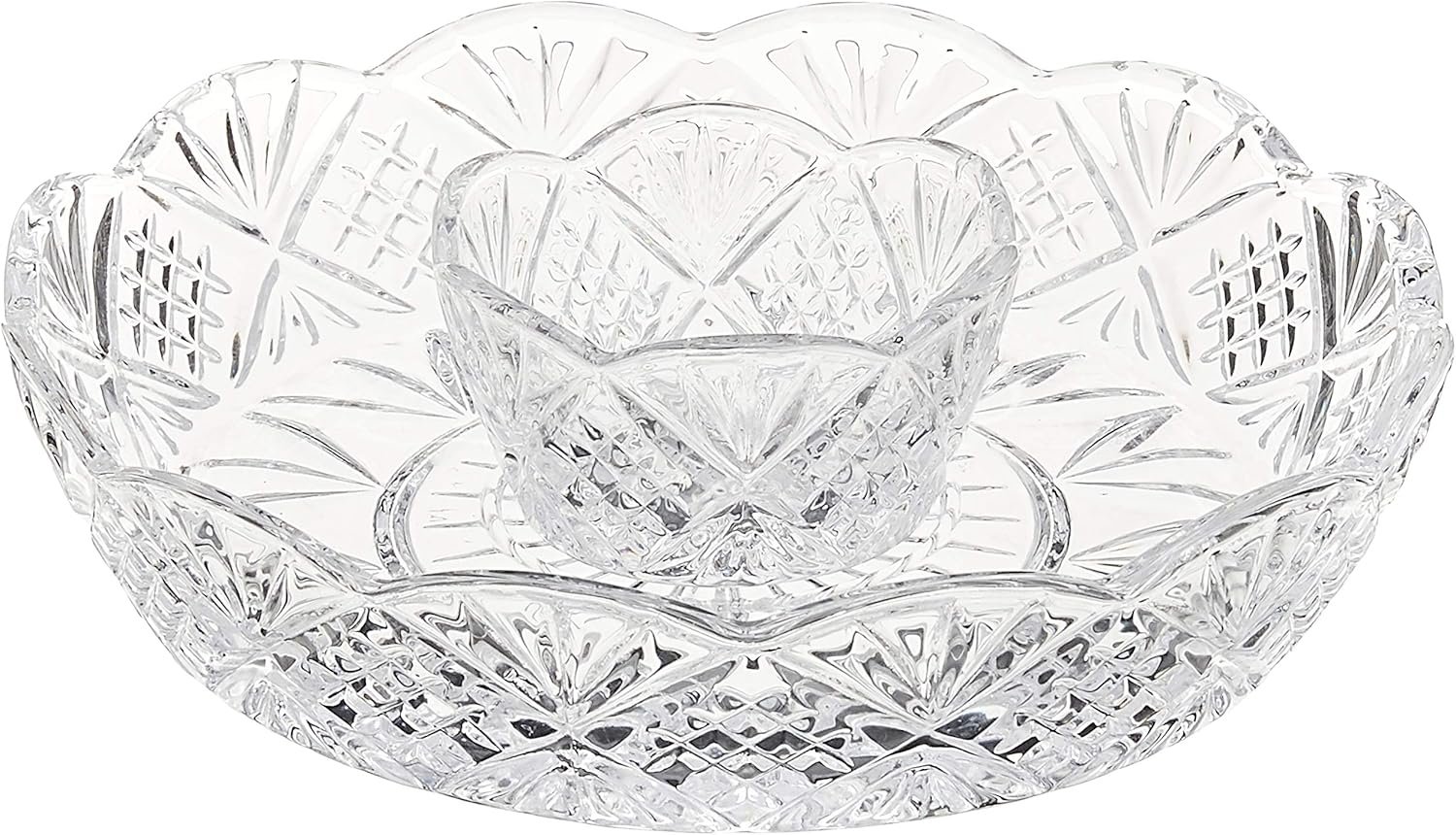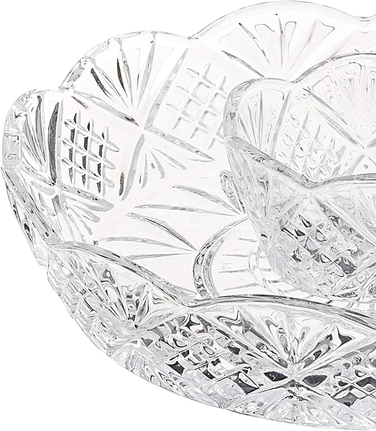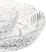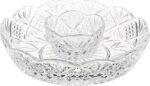 Godinger’s Dublin collection features a classic, light-catching design to dress up dinners and accent special occasions. Fashioned from 24-percent lead crystal, Dublin combines diamond and wedge cuts in a beloved Irish style that sparkles brilliantly. The heavy weight of the rich materials feels satisfying in the hand and lends durability to the elegant look. A wide range of serveware, barware, and accessories, Dublin pieces are suitable for holidays and parties as well as sophisticated daily meals.This lovely and petite Dublin chip and dip is a perfect serving piece for just two diners or for adding a selection of relish items to a table of four. With a central circular well and double scalloped rims, the piece maximizes capacity for its compact dimensions and looks great from any angle. Measuring 8 inches in diameter, it should be washed by hand for best care. A larger version is also available.