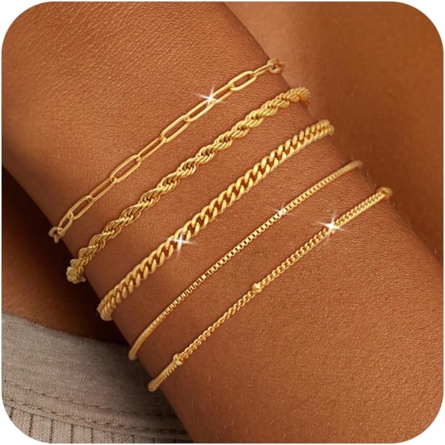 Gold Bracelets for Women, 14k Gold Plated Adjustable Dainty Bracelets Set Waterproof Jewelry Paperclip Cuban Chain Chunky Cute Bracelets Fashion Accessories Gifts for Womens