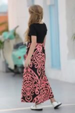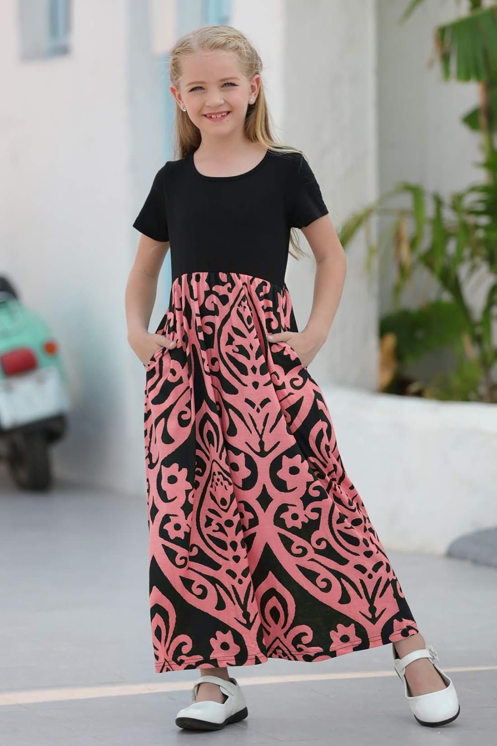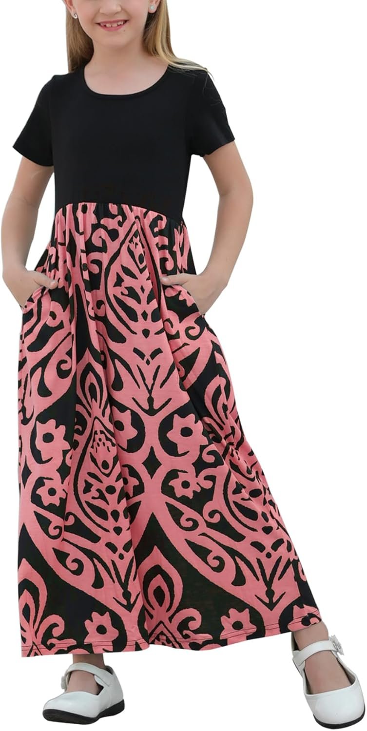 GORLYA Girl’s Short Sleeve Patchwork Floral Print Loose Casual Long Maxi Dress with Pockets for 4-12 Years Kids
