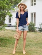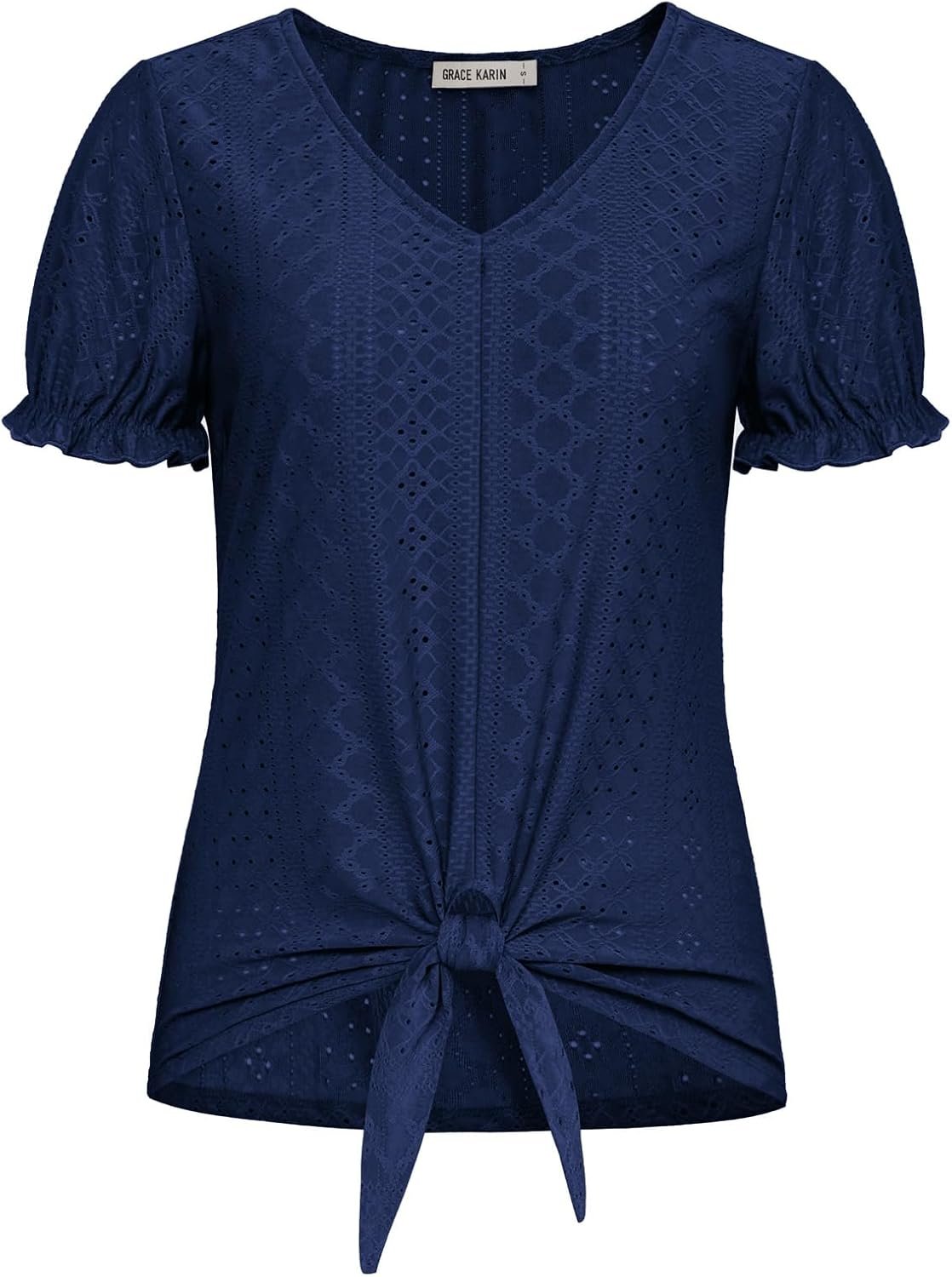 GRACE KARIN Women’s 2025 Summer Tops Short Sleeve V Neck Basic T Shirts Dressy Casual Tie Front Tops Eyelet Blouses Tunic