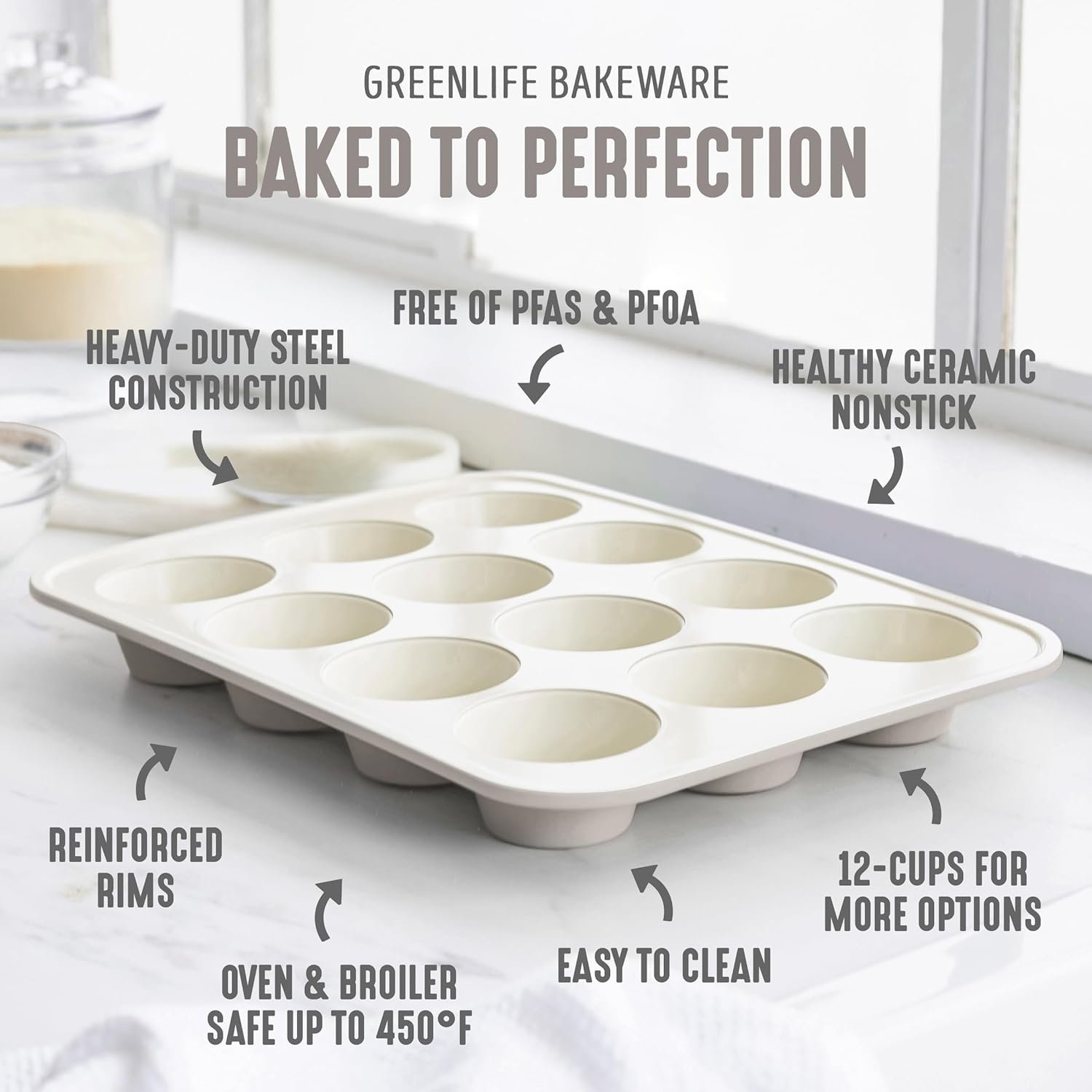 GreenLife 12-Cup Muffin Pan, Healthy Ceramic Nonstick Bakeware, PFOA & PFAS-Free Cupcake Tray, Durable Baking Pan, Versatile Kitchen Essential, Easy Clean Muffin Mold, Nonstick Baking Sheet, Taupe