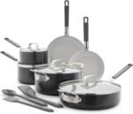 SET INCLUDES: 1.68QT saucepan with lid, 2.54QT saucepan with lid, 5QT stockpot with lid, 8″ frying pan, 10″ frying pan, 4.52QT sauté pan with helper handle, solid turner, slotted spoon, and large spatula