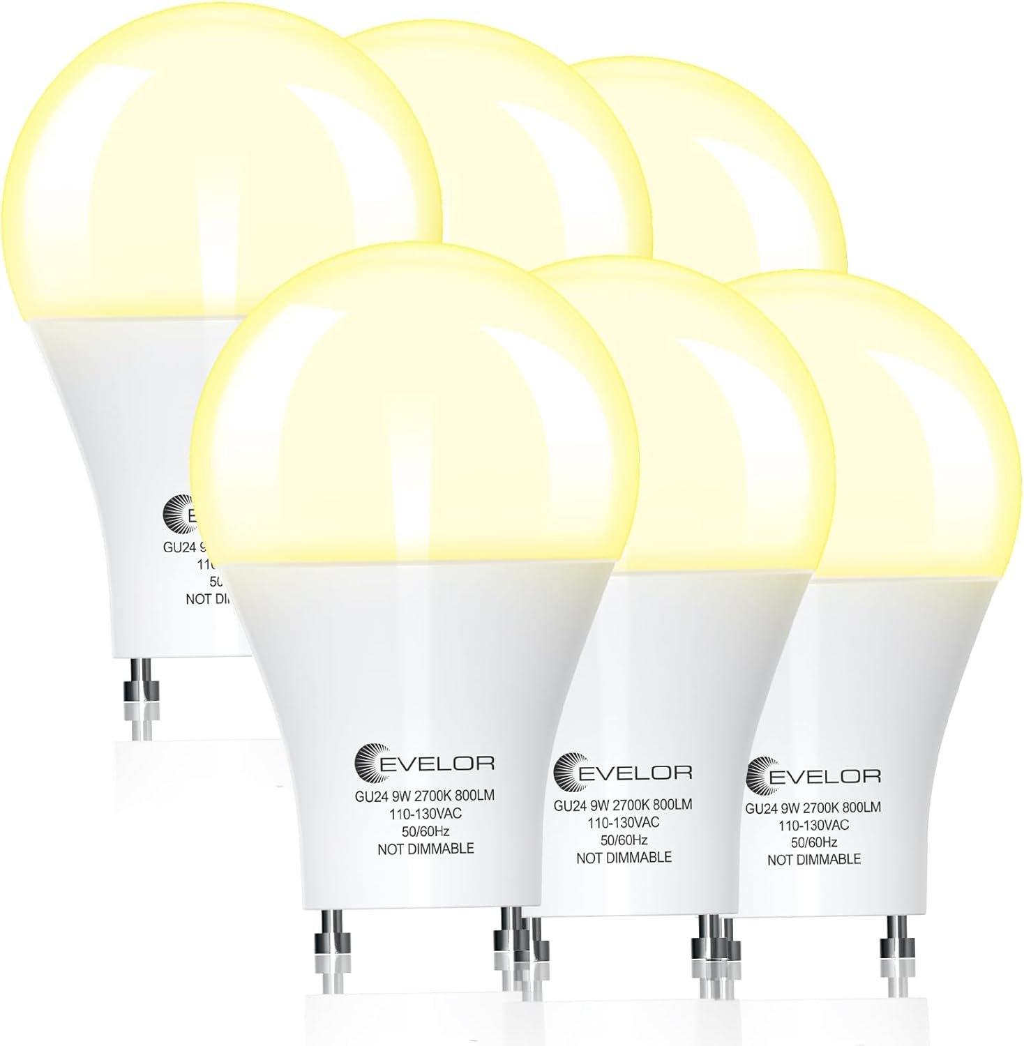 GU24 LED Light Bulb,60 Watt Equivalent Soft White 2700K,Non-Dimmable,Efficient 9W,800 Lumens 2 Prong Light Bulbs,15000 Hours,Ideal for Kitchen,Range Hood,Living Room,Bedroom,6-Packs