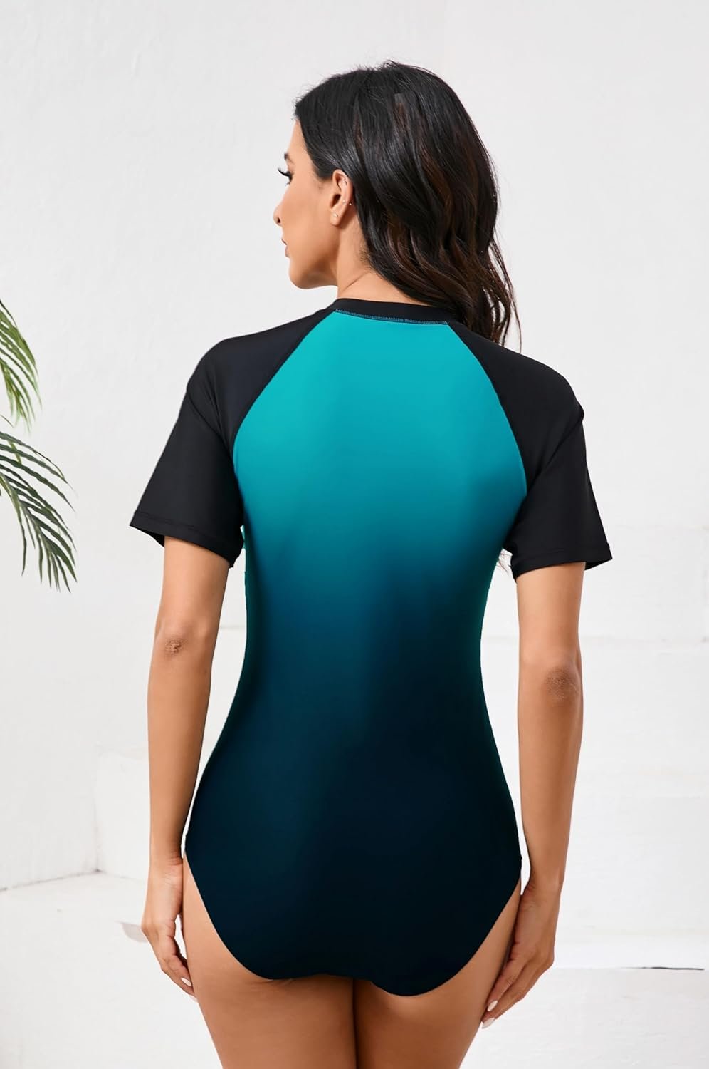 Halcurt Women’s Short Sleeve One Piece Rash Guard Swimsuit Zip Front UPF50+ Surfing Athletic Bathing Suit