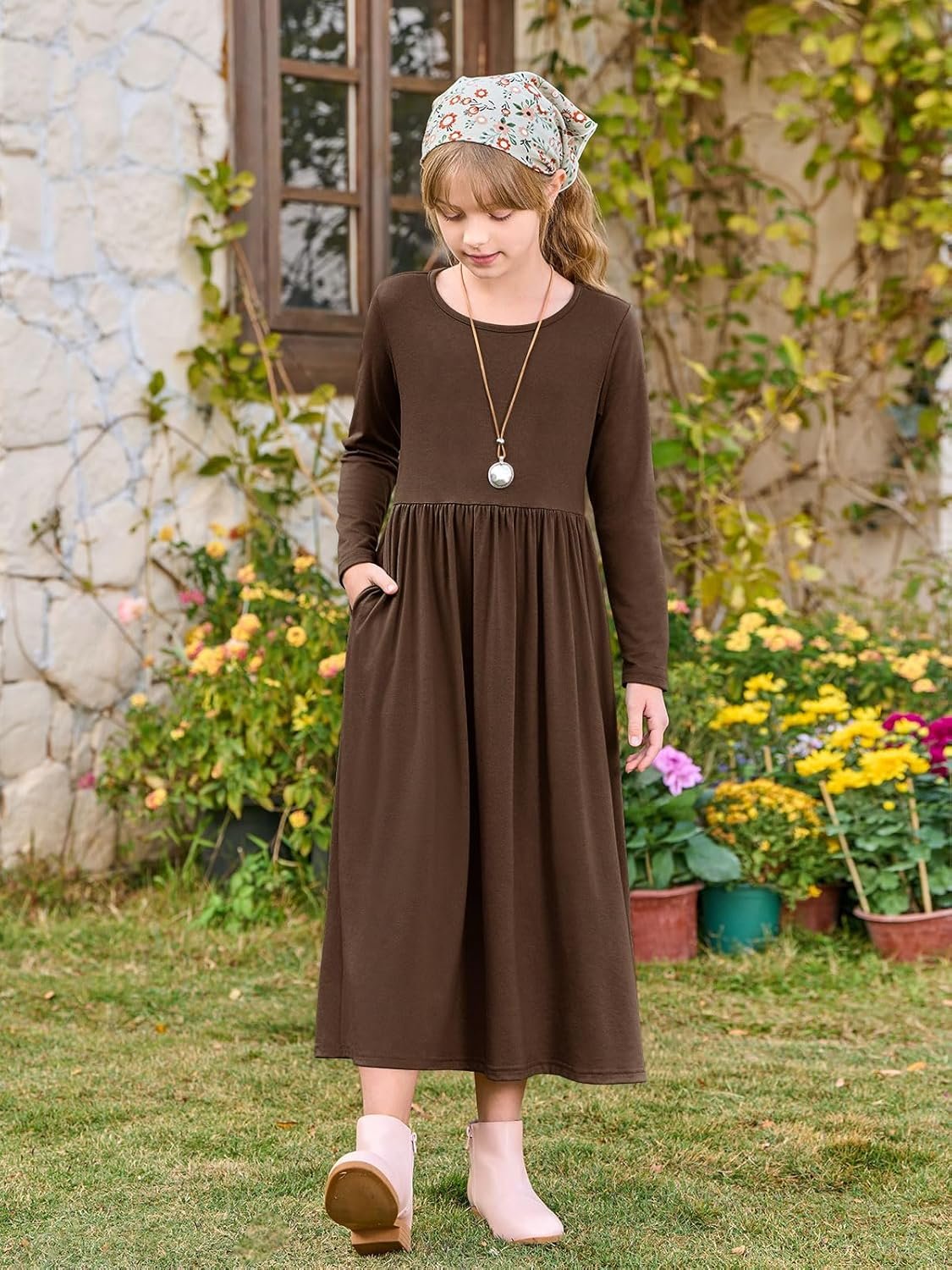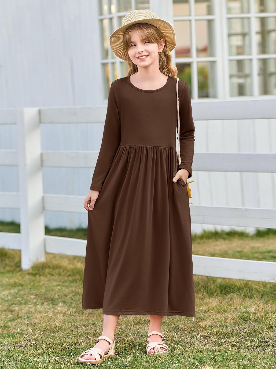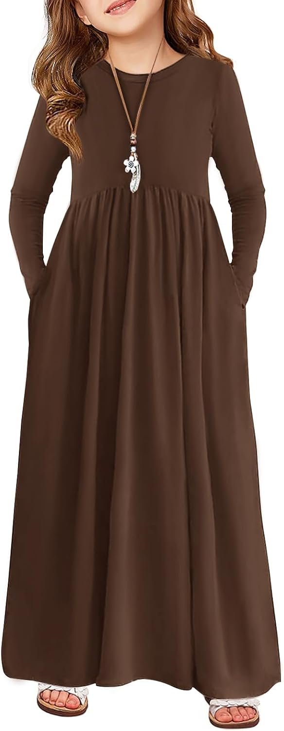 Haloumoning Girls Maxi Dress Long Sleeve Casual Holiday Dress with Pockets for 5-14 Years