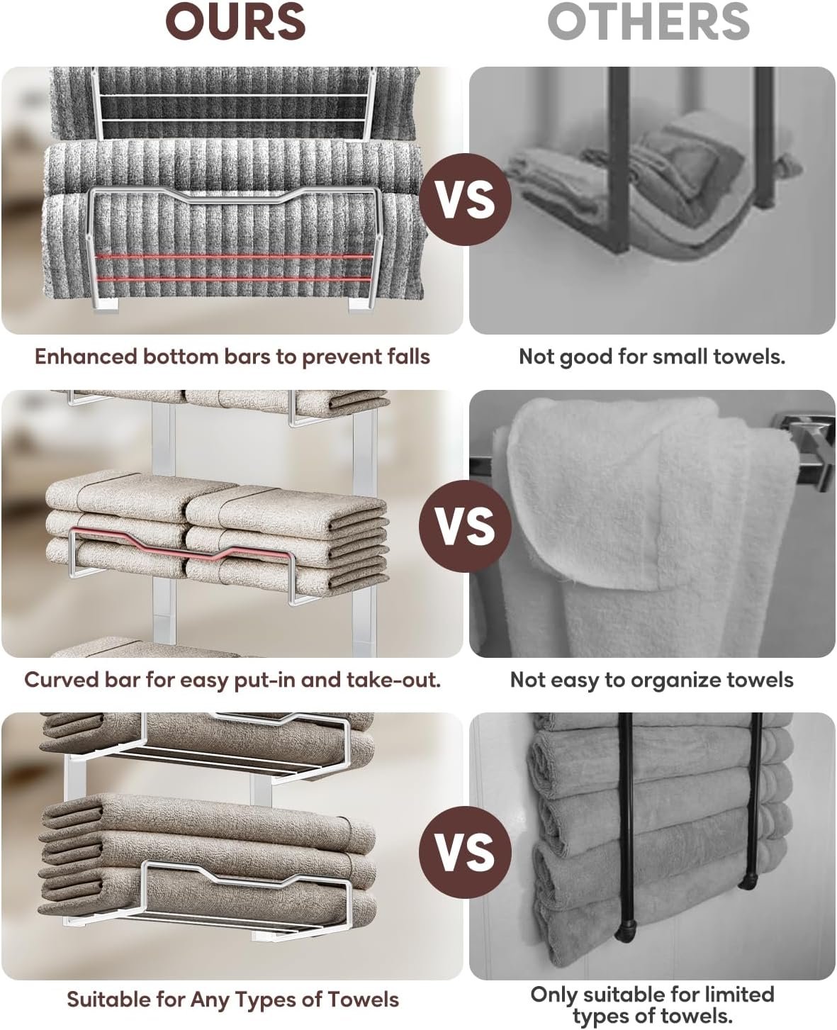 Larger Capacity Towel Organizer: This upgraded towel organizer for bathroom has 5 tiers with increased spacing. It can hold 2-3 folded or rolled towels per tier and 15 in total. Perfect for small living areas like apartments, bedrooms, dorm rooms, RVs, and campers.