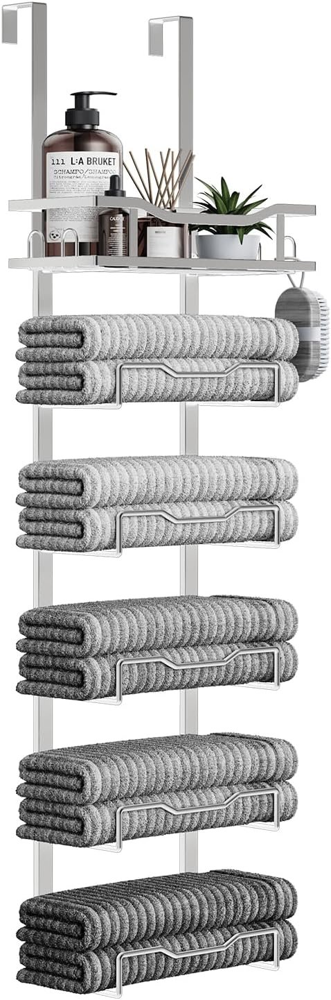 Space-Saving Towel Storage Solution: This vertical bathroom towel storage maximizes door space in small bathrooms, efficiently organizing towels for easy reach. The included top basket caddy is a great bonus to organize small bathroom accessories.