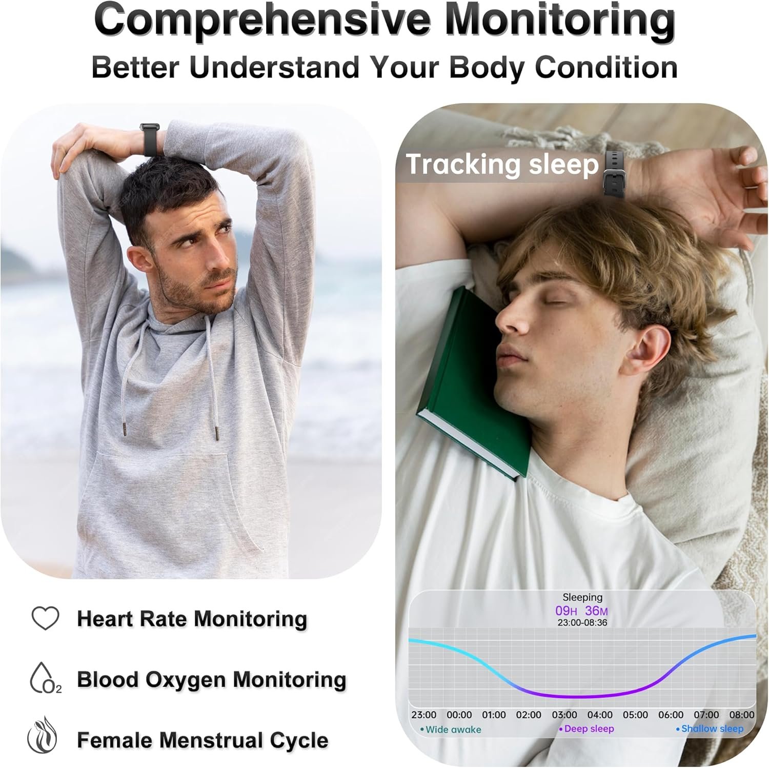 【Comprehensive Health & Sleep Tracker】This fitness and activity tracker offers 24/7 monitoring of your heart rate and blood oxygen levels. The sleep analysis feature tracks REM, light, and deep sleep phases, delivering detailed insights and personalized recommendations to enhance your rest. It also supports sedentary reminders and menstrual cycle tracking to help you maintain a balanced and healthy daily life.