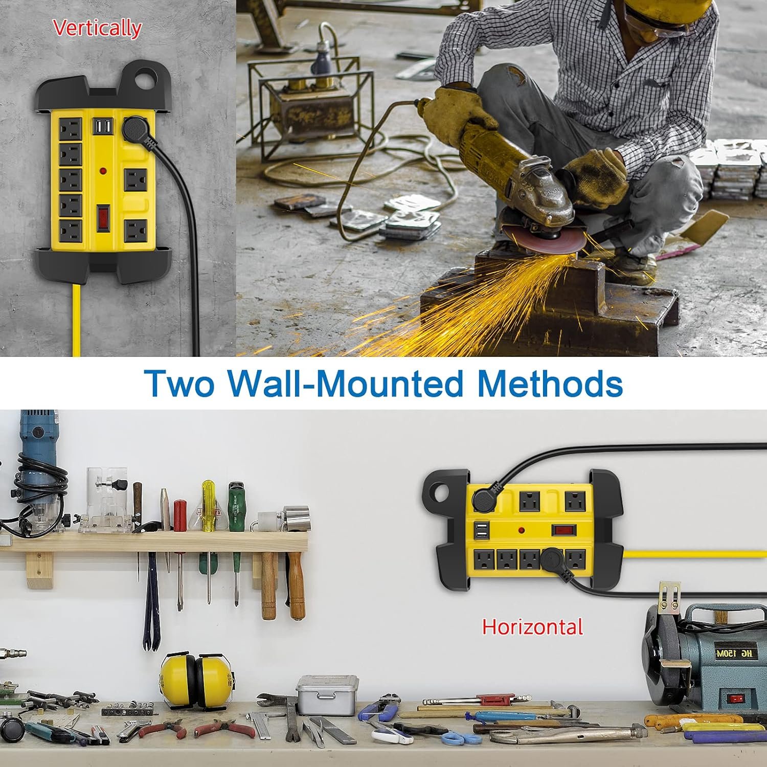 Metal industrial power strip with yellow aluminum housing and black outlets, wall mountable and built-in usb ports design, perfect for hooking up all the gadgets at work.