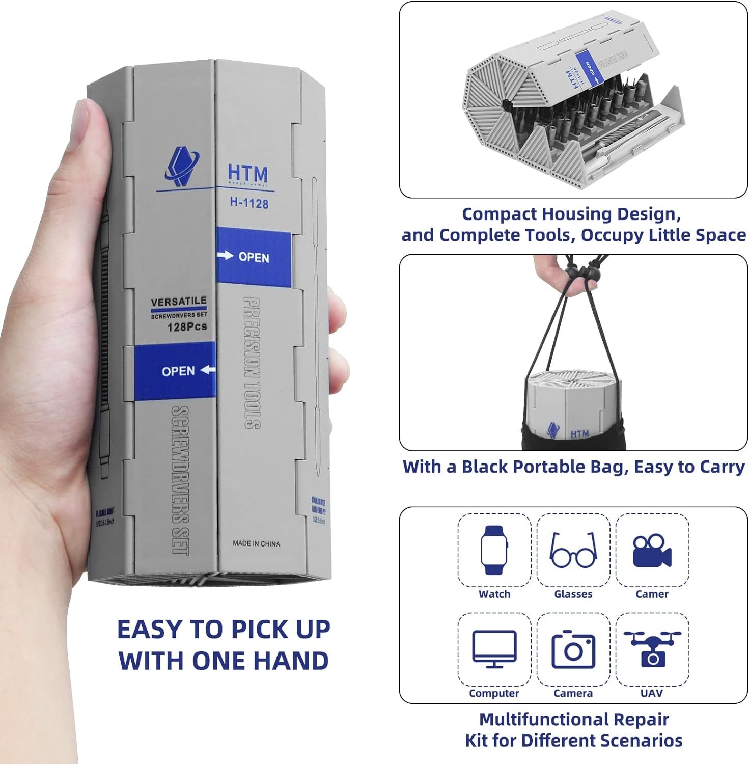 COMPACT WITH CASE DESIGN: The micro screwdriver set uses sturdy material for a unique case design, everything is safely fixed inside and will not fall out, unique housing, is easy to open, and cleverly uses of small space to accommodate 128 bits, each screwdriver recess is marked to quickly identify the screwdriver bit needed, compared with the screwdrivers on the market, when not in use Save space, when using the screwdriver model complete, with a portable pouch, suitable for travel or carry out.
