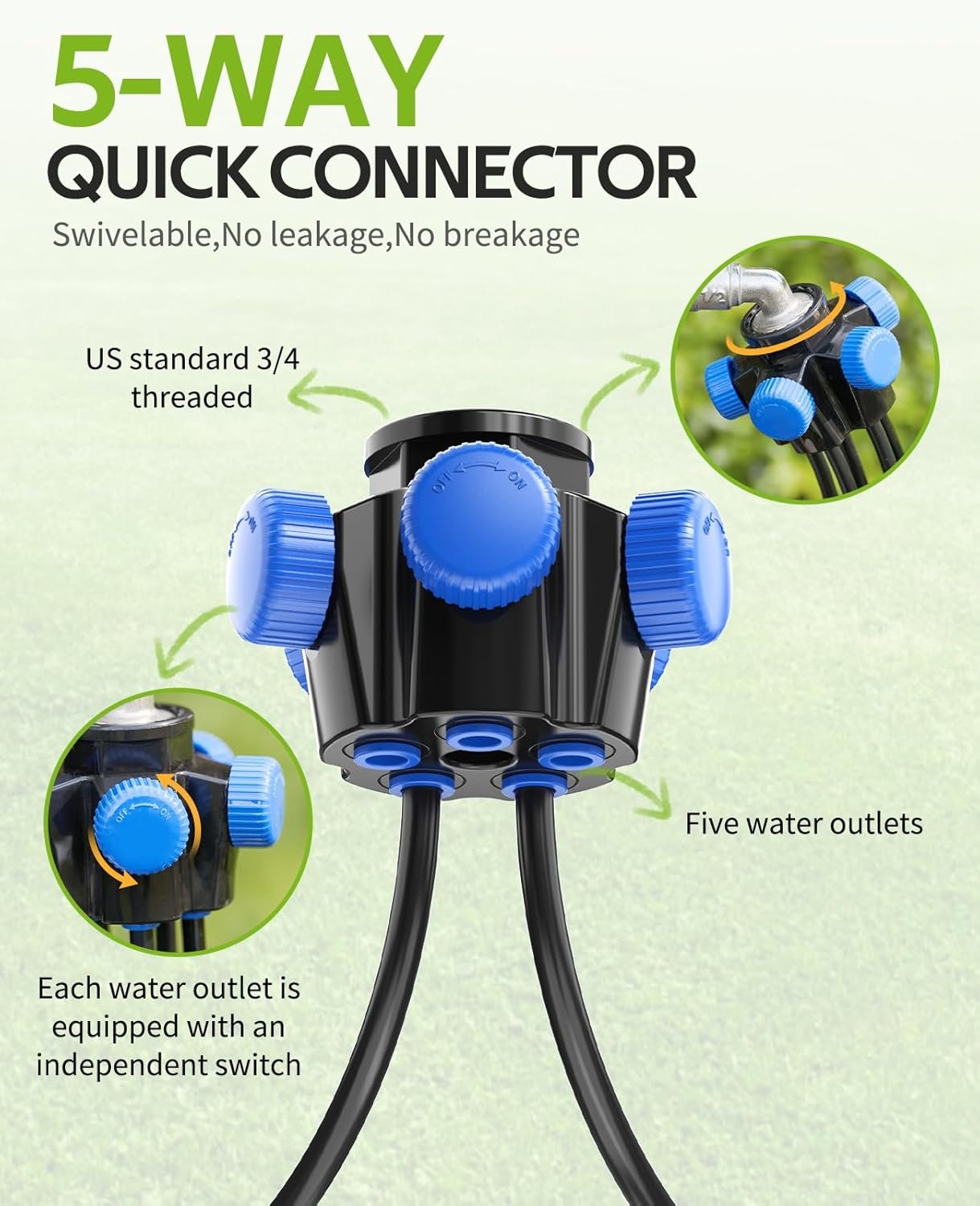 5-Way Quick Connector: Our connector has 5 water outlet channels connecting 1/4 “irrigation tubing. Each channel has an independent switch, which can meet different irrigation needs at the same time. The tubing interfaces are all quick-connect designs