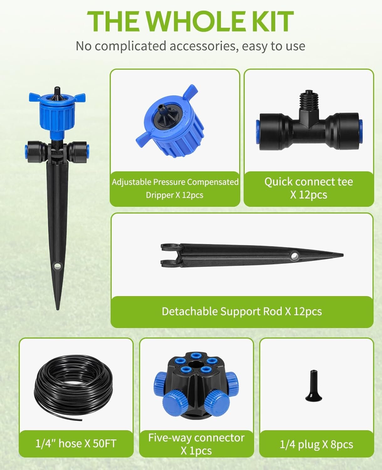 The Whole Kit to Make Drip System: The irrigation system kit contains 50FT irrigation tubing, 1Pcs five-way connectors, 12Pcs adjustable pressure compensation drippers, 12Pcs Support rod, 8Pcs 1/4″ end plug, without you having to buy any more tools