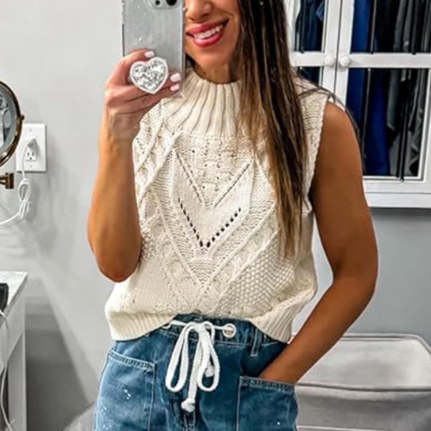 Hixiaohe Turtleneck Crochet Sweater Vest Fall Fashion Knit Sleeveless Tank Tops for Women Lightweight Casual Pullover Clothes
