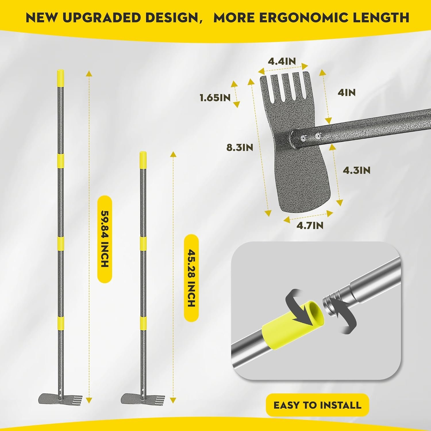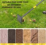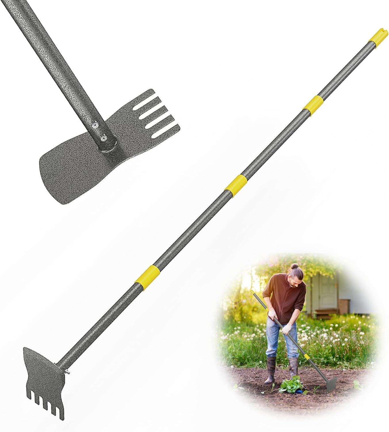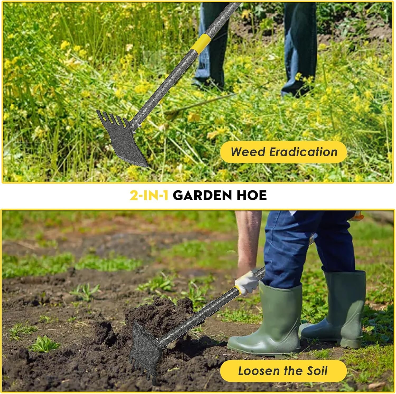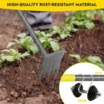 ⛏ADJUSTABLE LENGTH HANDLE: The handle of this garden hoe consists of multiple rods connected by a threaded interface, which allows you to increase or decrease the number of rods to achieve a length that suits your height and reduces the pain caused by bending your back. The poles have double screw fastening to the hoe, which is stronger and more durable, and the hoe is not easy to separate from the poles.