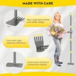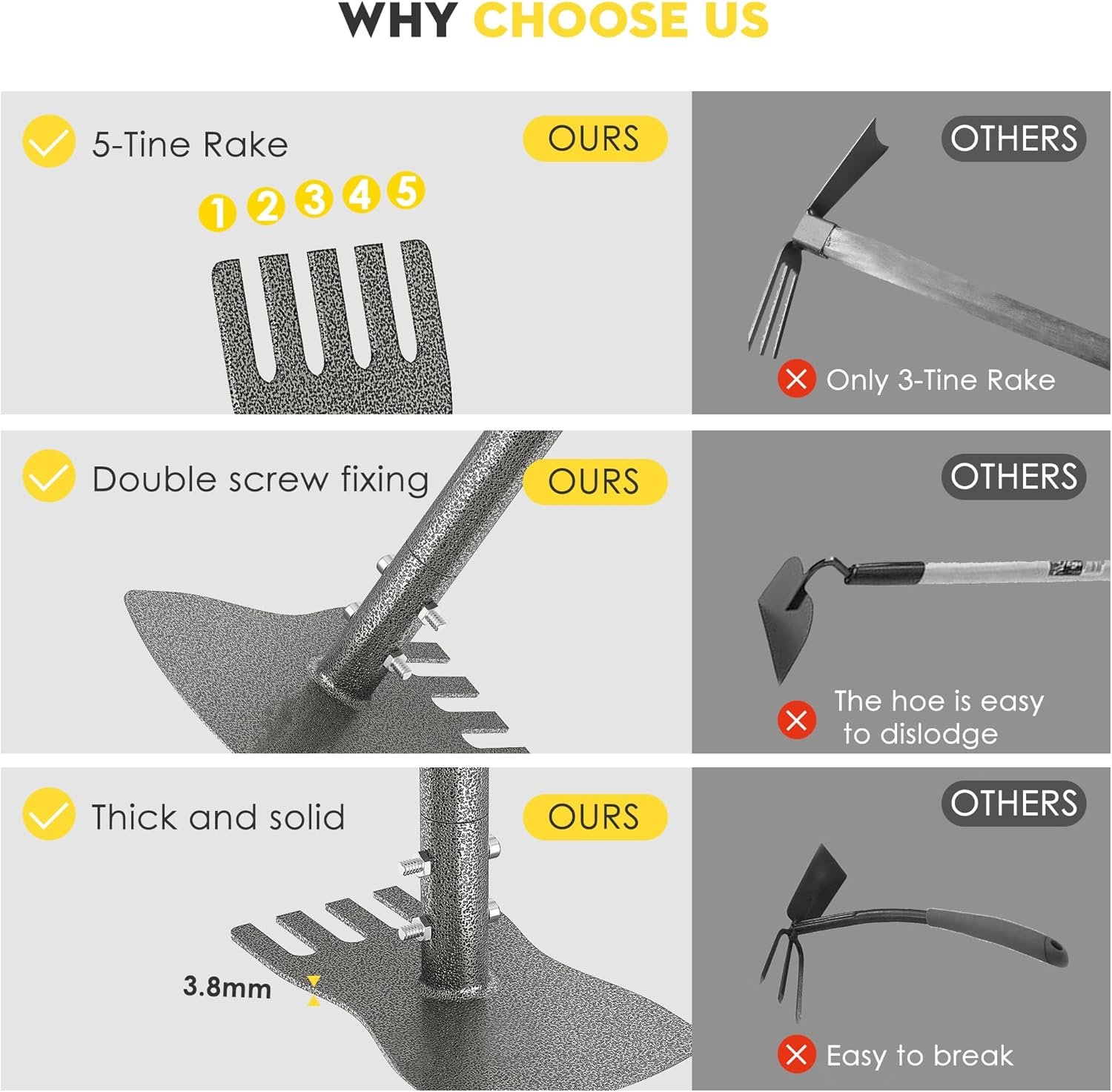 ⛏TWO-IN-ONE COMBO GARDEN HOE: Combination of hoe and rake head, both loosening soil and weeding, just flip the handle to switch garden tools, reduce the inconvenience of carrying more than one tool, save the time of replacing the tools, make your work in the garden more professional and efficient. Square wide hoe head for weeding and digging with less effort, 5 bars rake head makes loosening soil easier.