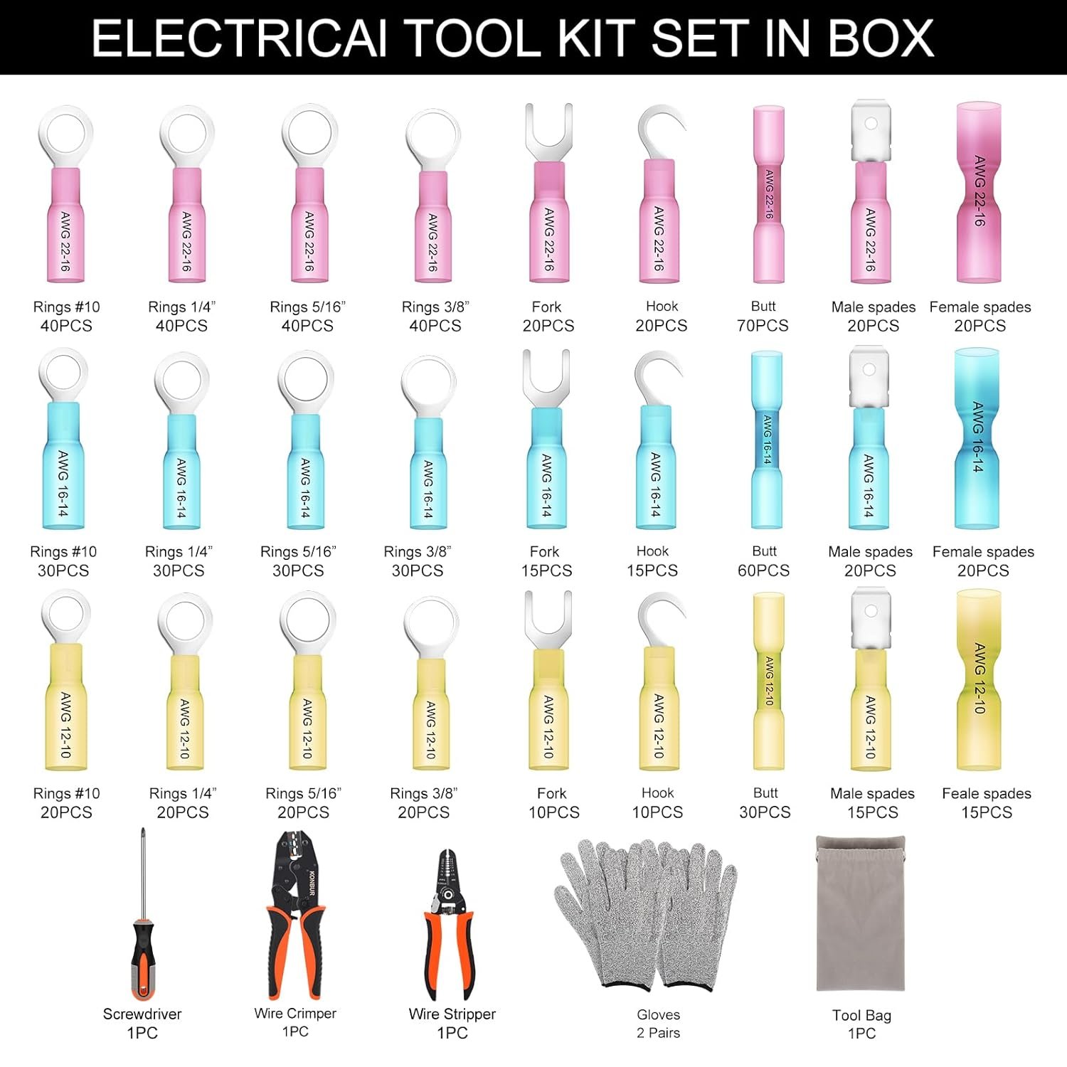 18xHeat Shrink Wire Connectors 450PCS 3x Heat Shrink Butt Connectors 160PCS 3xHeat Shrink Spade Terminals 110PCS 5xCopper Wire Lug&tubing 72PCS 3xCable Ties 190PCS Scratch-Resistant Gloves 2PAIRS Screwdriver 1PC Wire Stripping Tool 1PC Terminal Crimper Tool 1PC Compact Tool Box Kept tidy and organised in a tool box for simple storage and easy carry anywhere