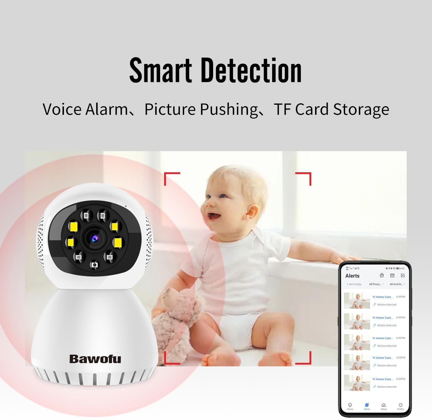 With high-sensitivity CMOS image sensor, F1.2 large aperture and 6pcs infrared lights, bawofu home camera displays a sharper image in the night up to 25ft.
