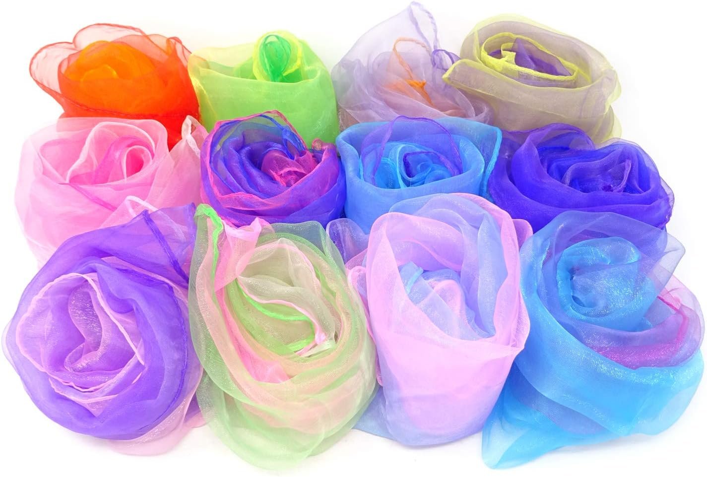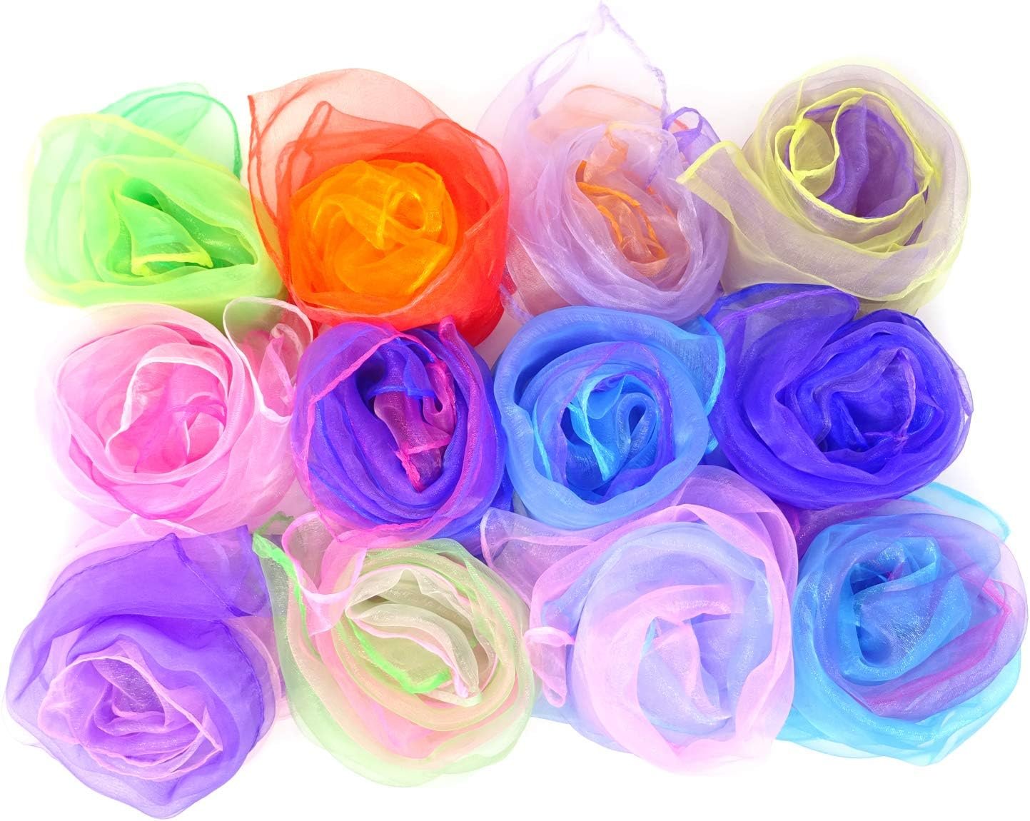 Customers appreciate the variety of colors and gradual color transitions on these scarves. They find the scarves beautiful and fun to use for imaginative play and dancing. The scarves are functional and of good quality.