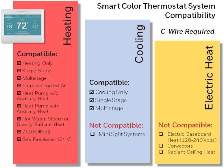 COMPATIBLE WITH: Forced air (gas, oil or electric), hot water and steam, and heat pumps with electric backup. Does NOT work with electric baseboard heat (120-240V). C-WIRE REQUIRED. Before purchasing, check to see if this smart programmable thermostat is compatible with your home and to determine if your home needs a C-wire power adapter.