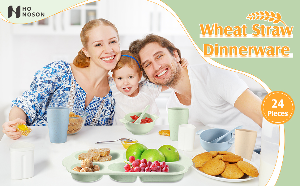 Honoson 24 Pcs Wheat Straw Dinnerware Cutlery Set Including Divided Plates Microwave Dishwasher Safe Bowl Unbreakable Tableware Straw Cutlery Spoon Knife Fork Cup(Beige/pink/green/blue)