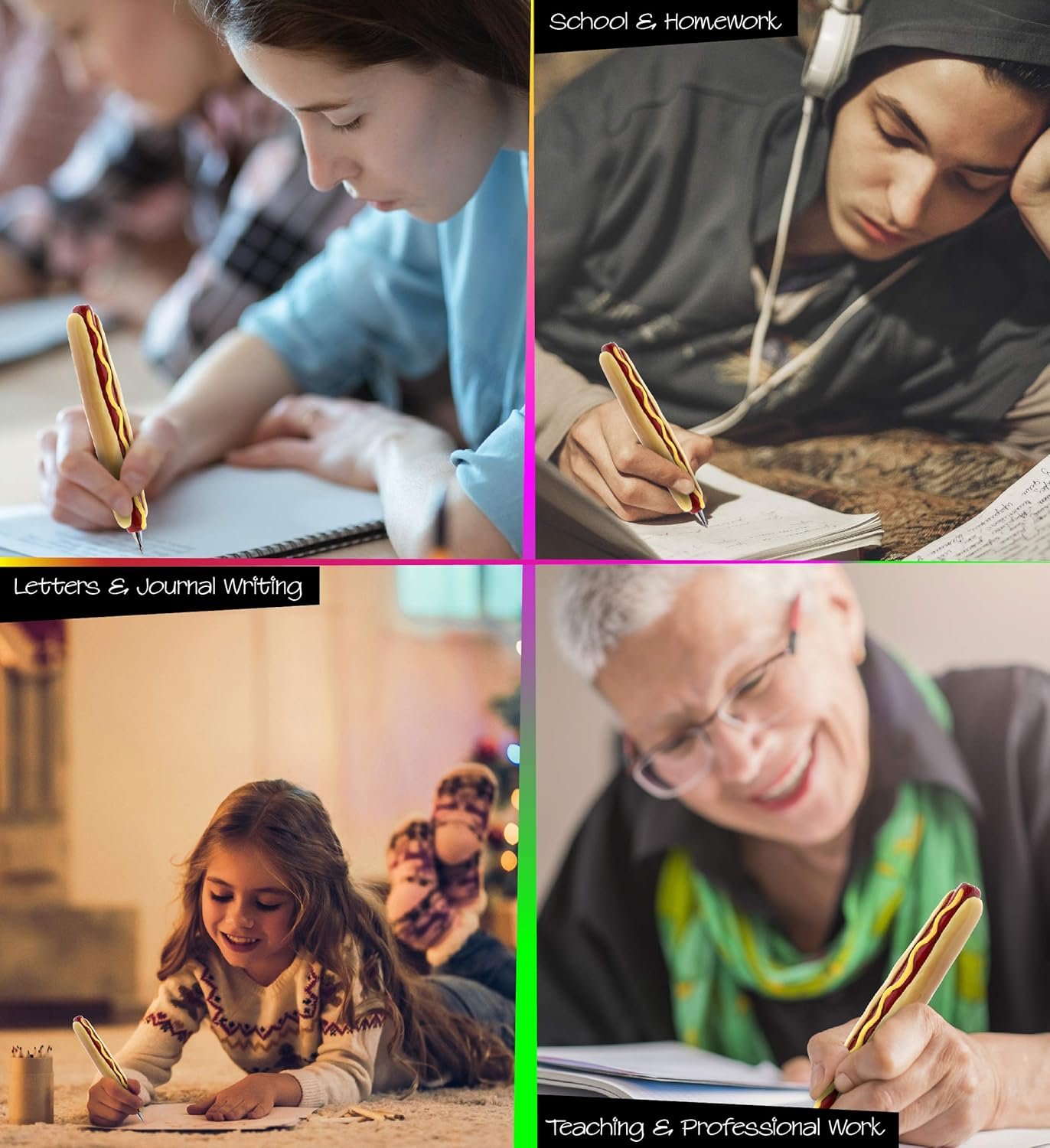 The hotdog ink pens for writing are made of high-quality lightweight resin, hand-painted with non-toxic paint. black ballpoint pens write permanent black ink that dries quickly and does not smudge on paper. Our hotdog funny pens are designed with a comfortable grip and a ballpoint that dispenses ink from the cartridge smoothly. The perfect black pen for journalists, school pens for food-lover students, or good pens for writing in the office.