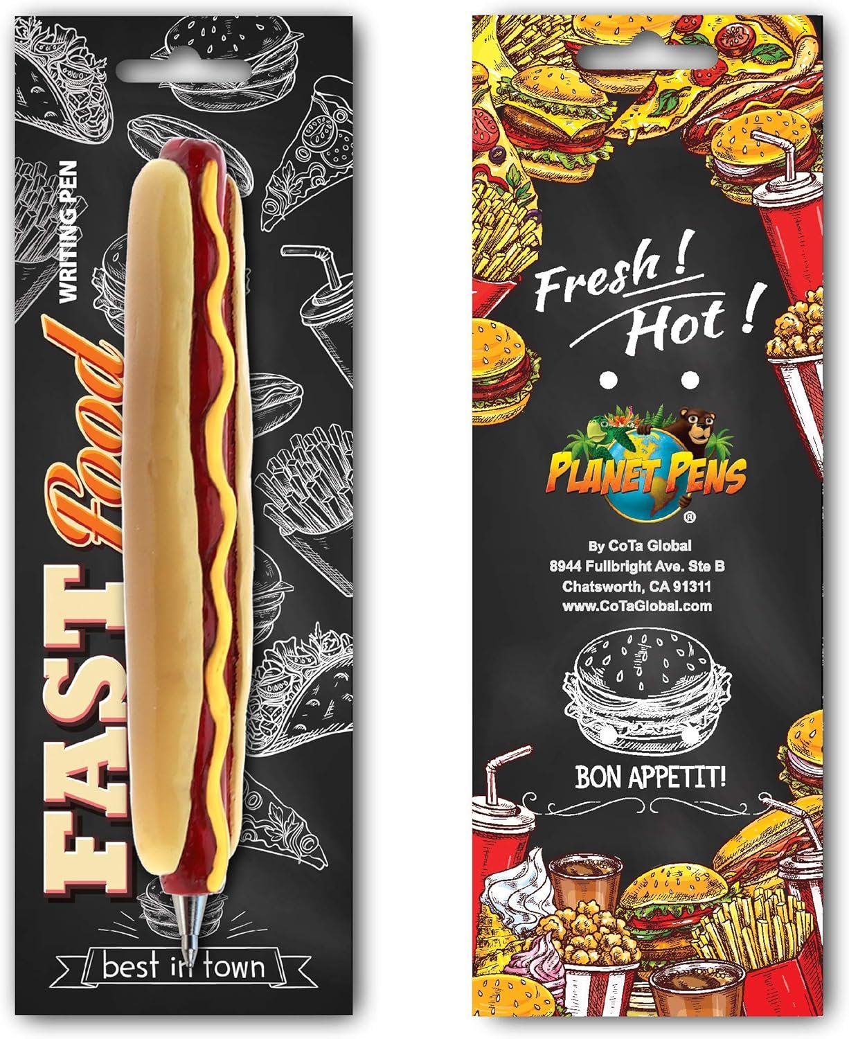 Includes 1 Planet Pens Hotdog Writing Pen. This cool pen resembles a bun with a hotdog inside, topped with realistic-looking swirls of mustard and ketchup. This fun pen measures about 6 inches long. It comes with black ink and is placed in the unique fast food-themed card. Whether you’re journaling, writing notes, or using it as your party favor or decor, this hotdog unique pen is sure to capture every food lover’s attention.