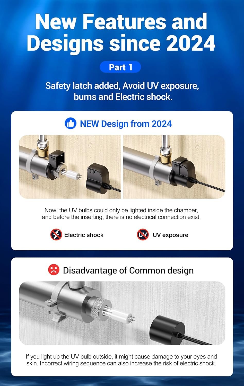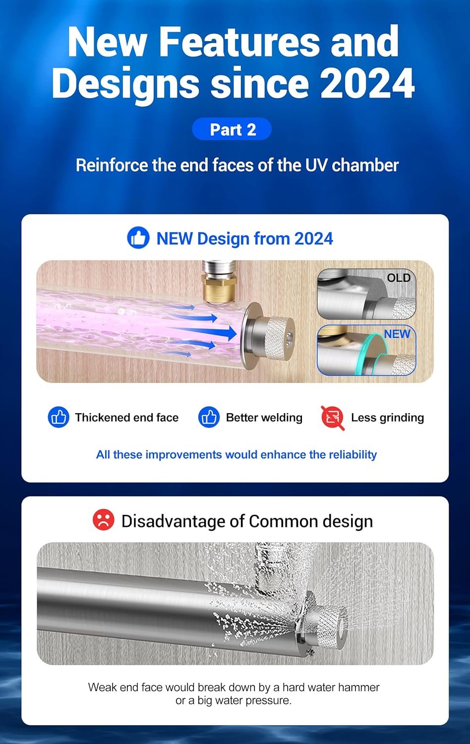 Safety and Reliable, 304 stainless steel and Quartz glass are proved to be reliable in different temperature, pressure, pH. And the only materials that will contact with your water.