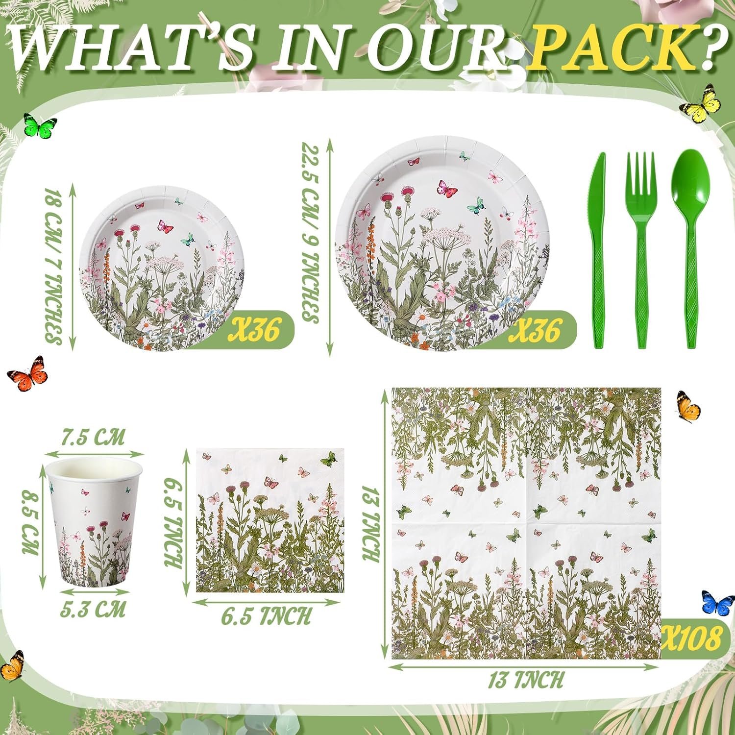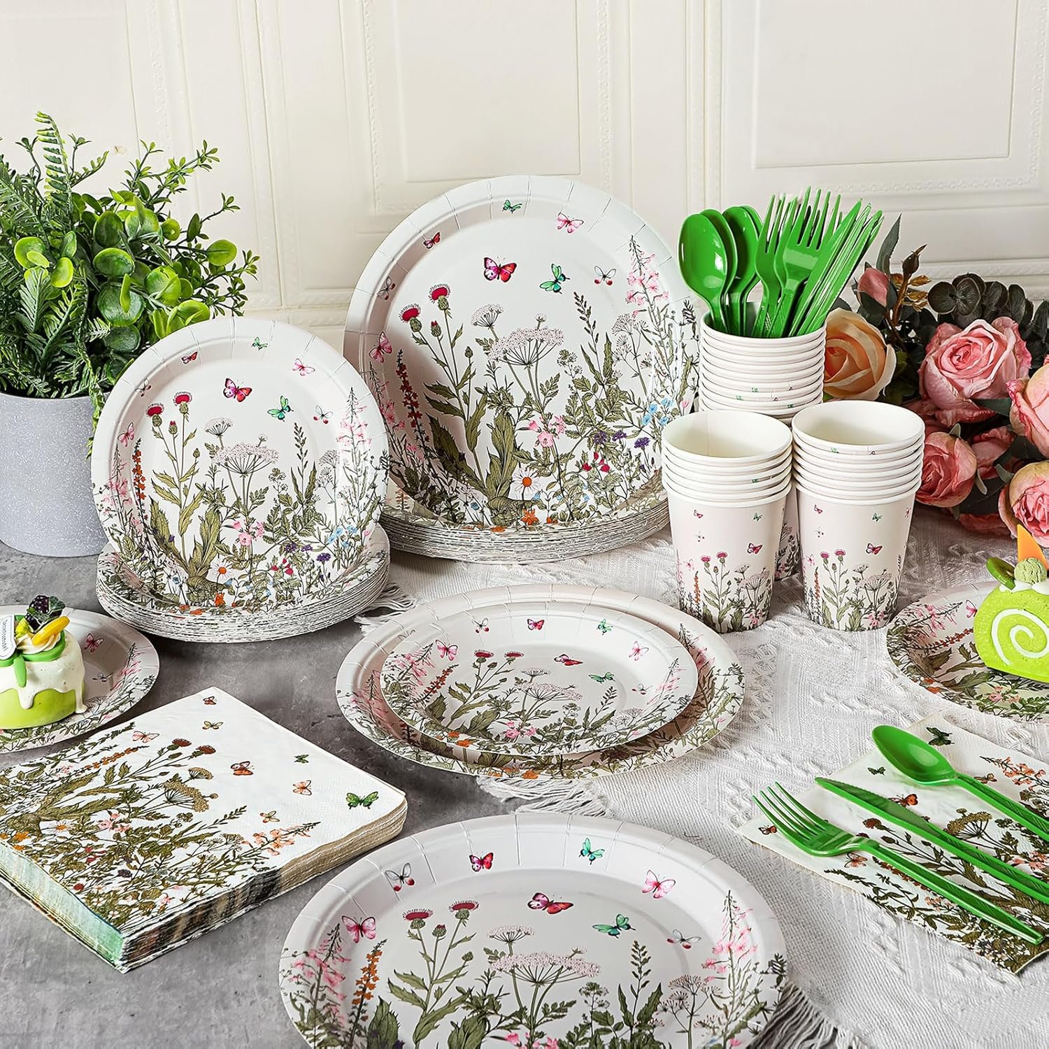Hushee 324 Spring Wildflower Plates and Napkins Set Wild Floral Paper Dinnerware Disposable Party Supplies Knife Fork Spoon Baby Shower Tableware Serves 36 Guests for Birthday Wedding Party