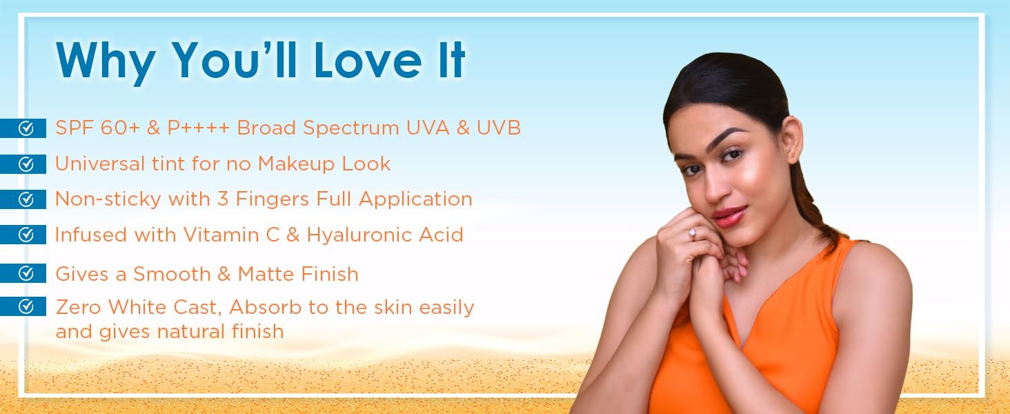 Protects from UVA/UVB Rays: SPF 60 and PA++++, the Glow+ Infused Tinted Sunscreen Broad spectrum protects you from pollution, blue rays UVA & UVB radiation, Helps to fight dark spots, premature aging and skin darkening that happen due to sun damage.