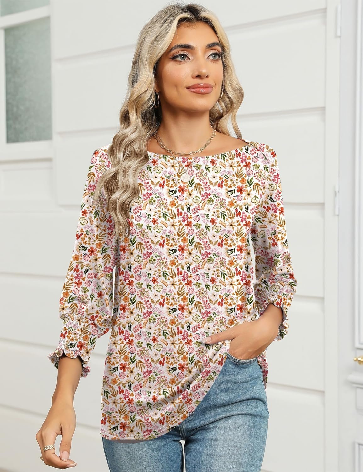 Be the first to review “IECCP 3/4 Length Sleeve Womens Tops Summer 2025 Fashion Trendy Boat Crew Neck Smocked Work Dressy Casual T Shirt Blouses”