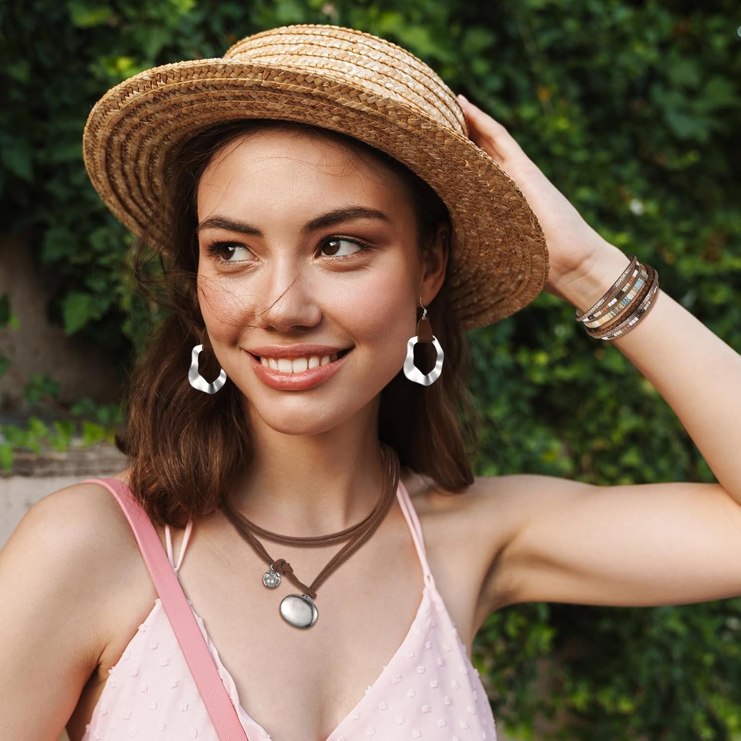 Inbagi 3 Pcs Western Jewelry for Women Bohemian Set, Boho Pendant Long Choker, Faux Leather Layered Bracelet, Dangle Earrings