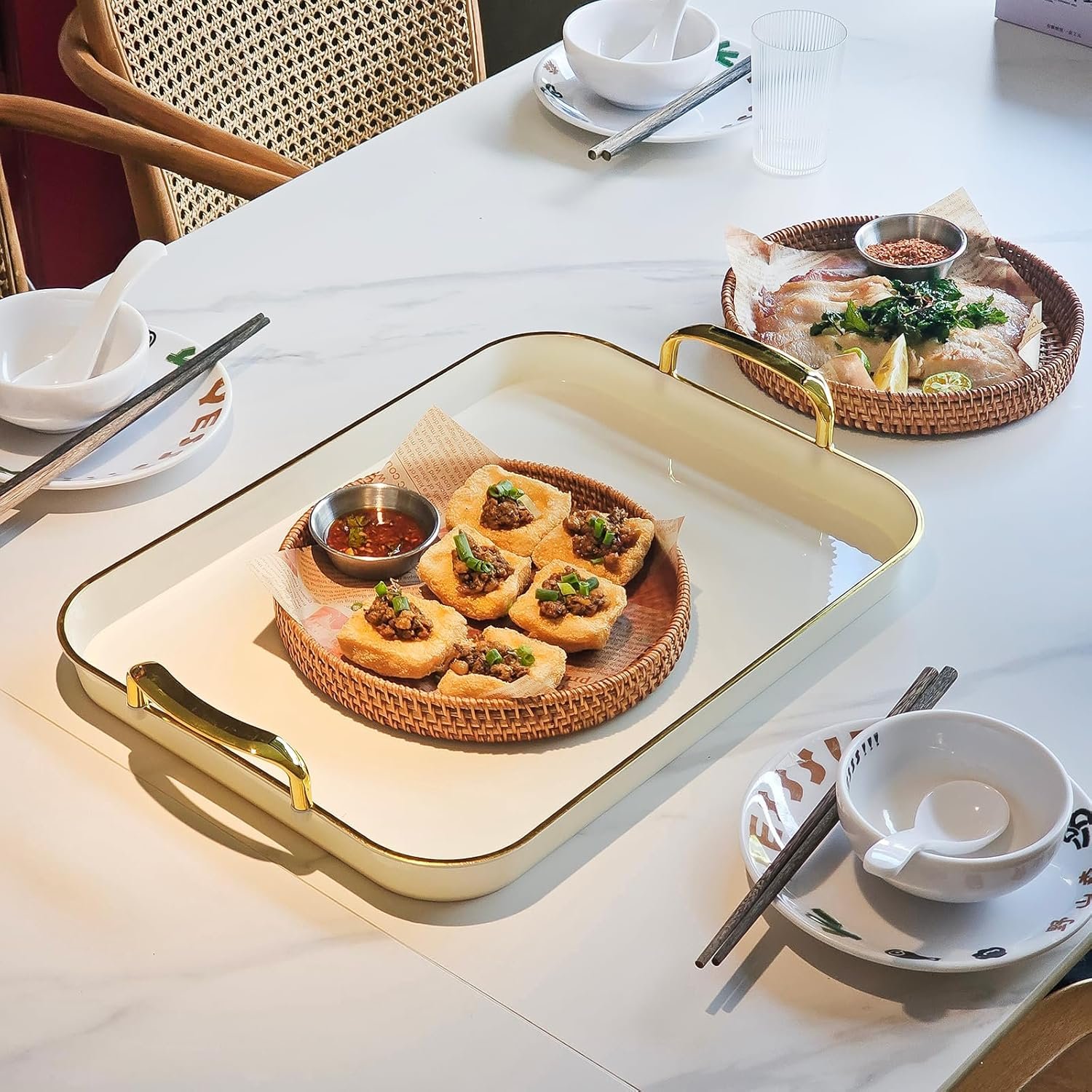 Two golden handles on the left and right sides of the serving tray help you deliver the product to its destination more safely