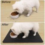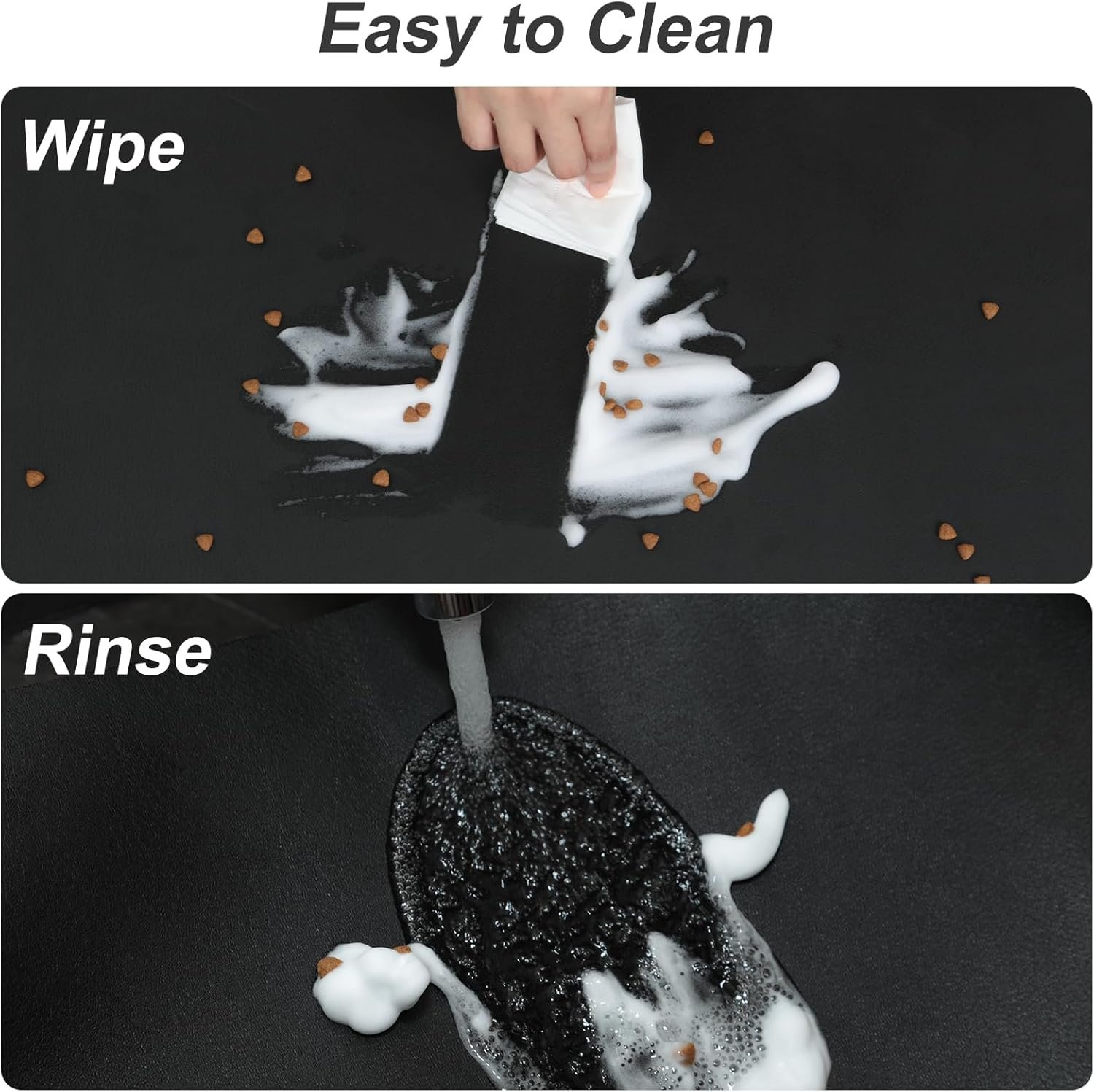 Easy to clean: This dog mat for food and water is made of special material, it will not be stained with animal hair and dust, the pet feeding mat will look brand new just wipe it with a damp cloth or rinse it with water