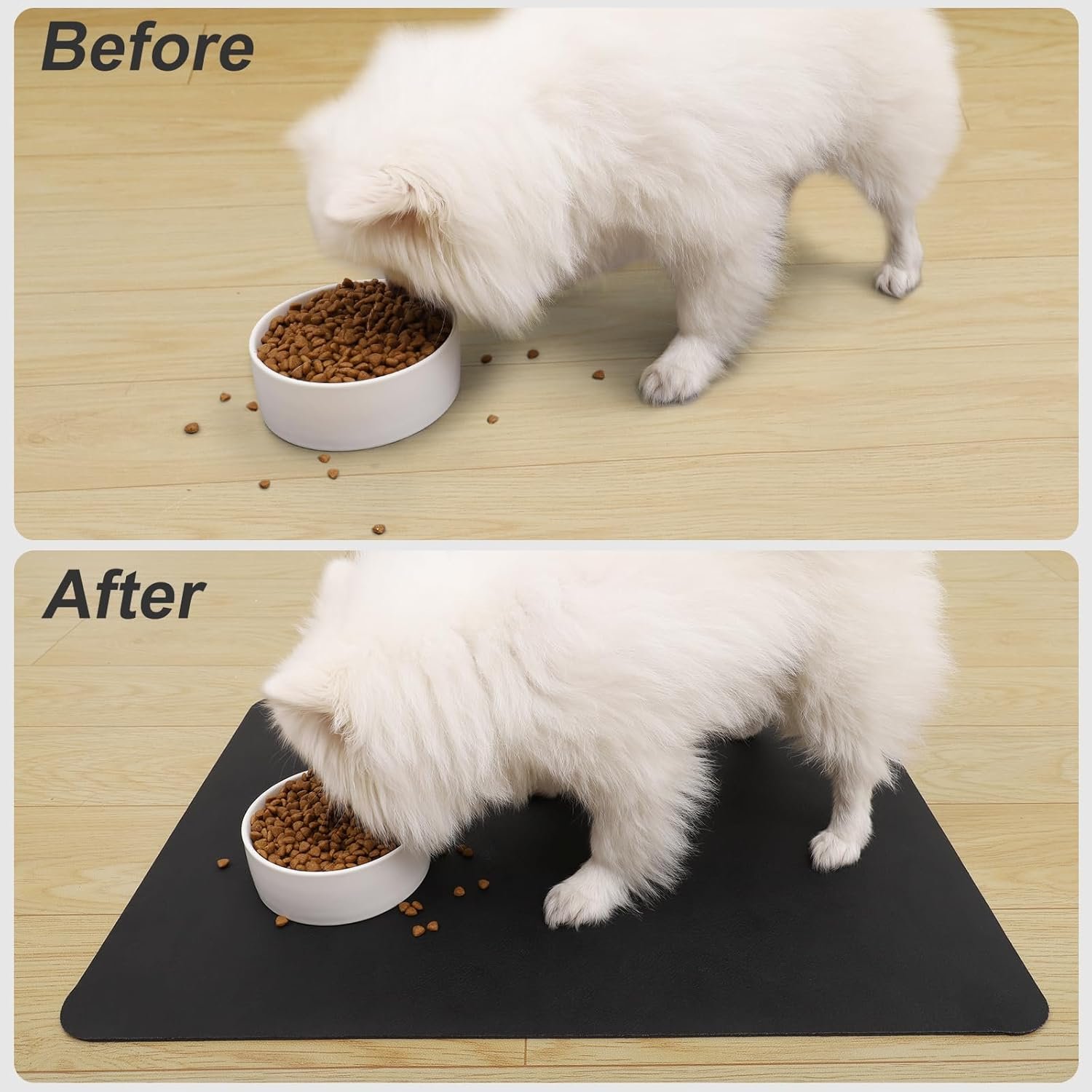 Pet friendly & durable: The sturdy dog water bowl mat are are very durable and not easy to tear , which prevents pets from eating them by mistake. The cat food mat also has no pungent smell, which is very pet-friendly