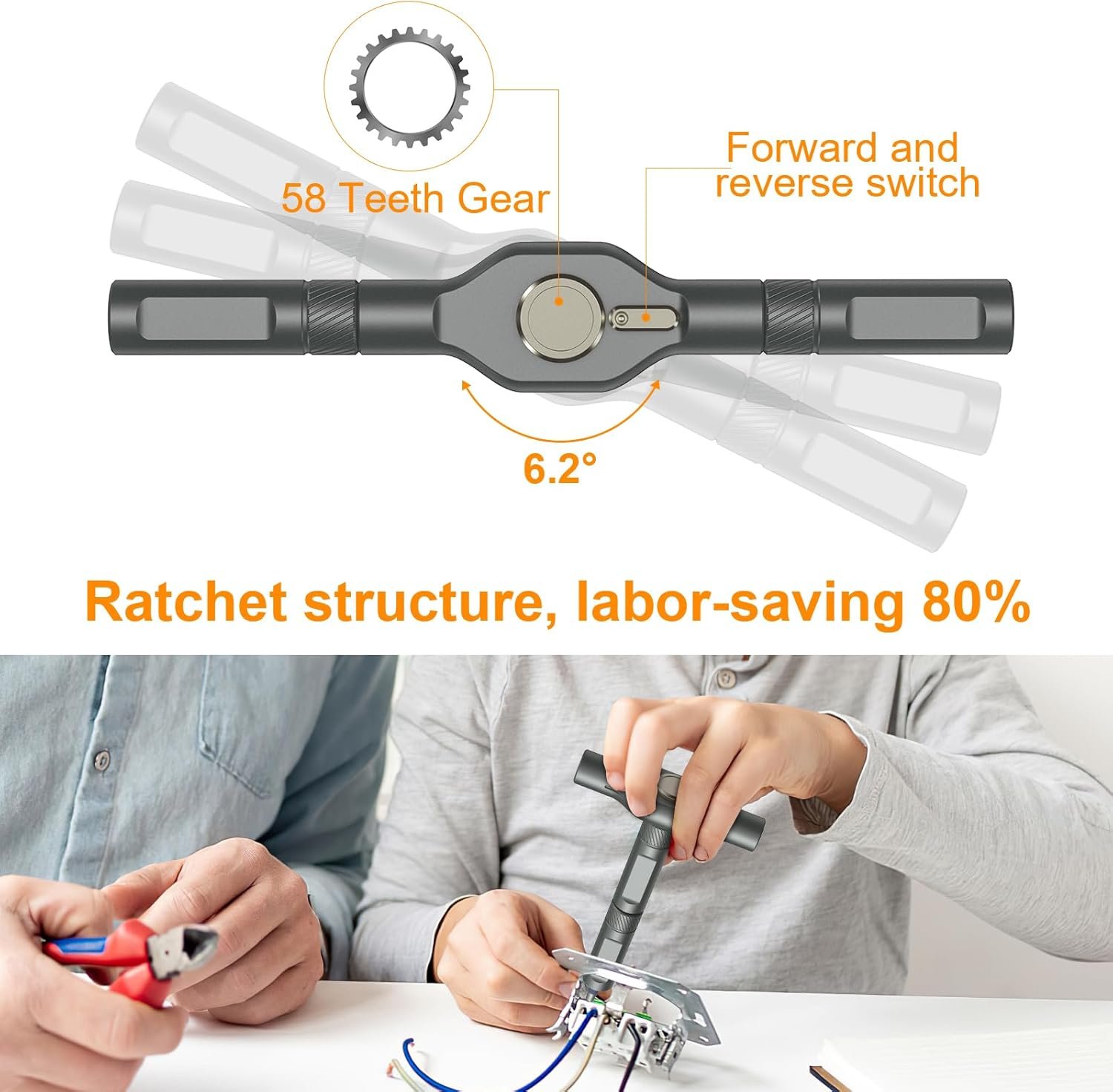 Power-saving ratchet design, aluminum alloy handle multi-purpose screwdriver, with 6.2 degree ratchet power-saving design, 58 teeth forward and reverse ratchet structure, very power-saving.