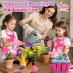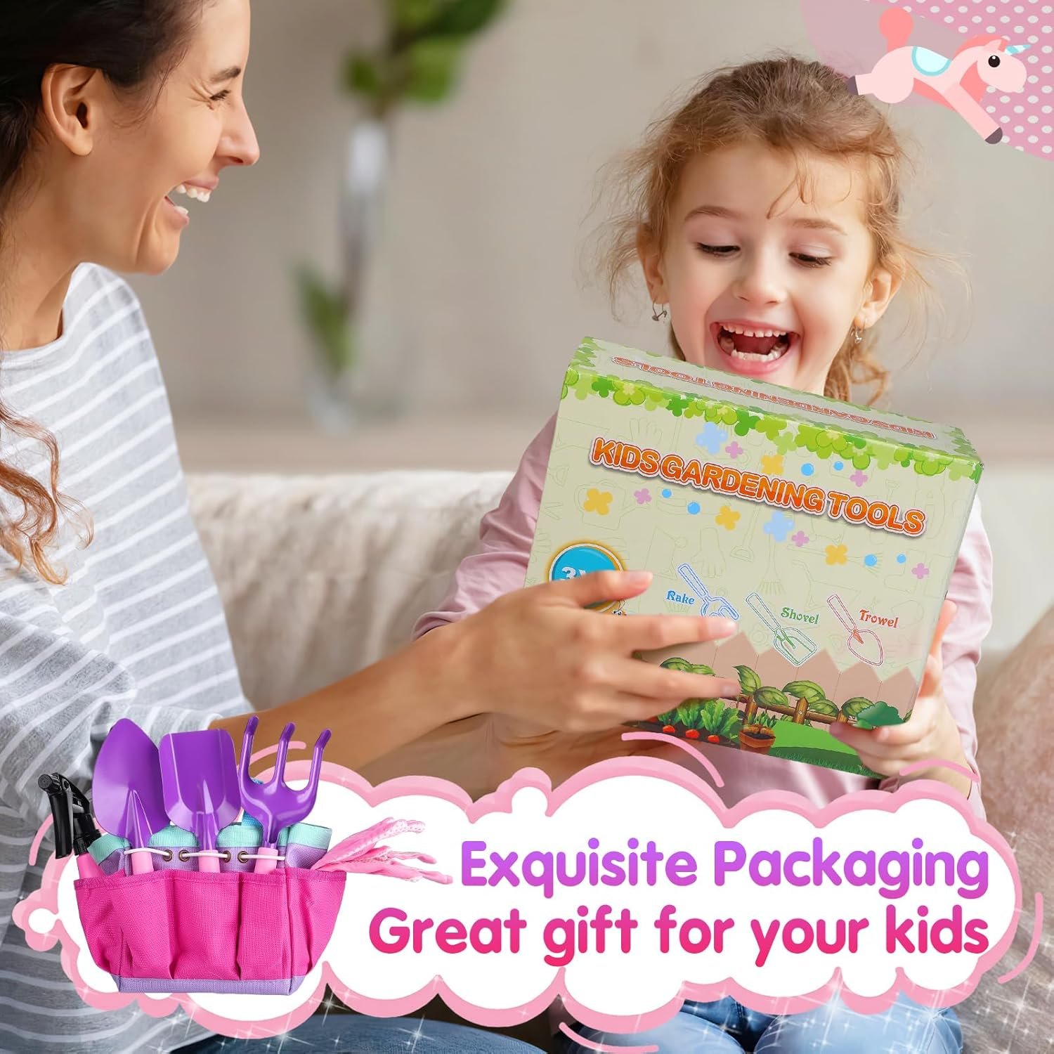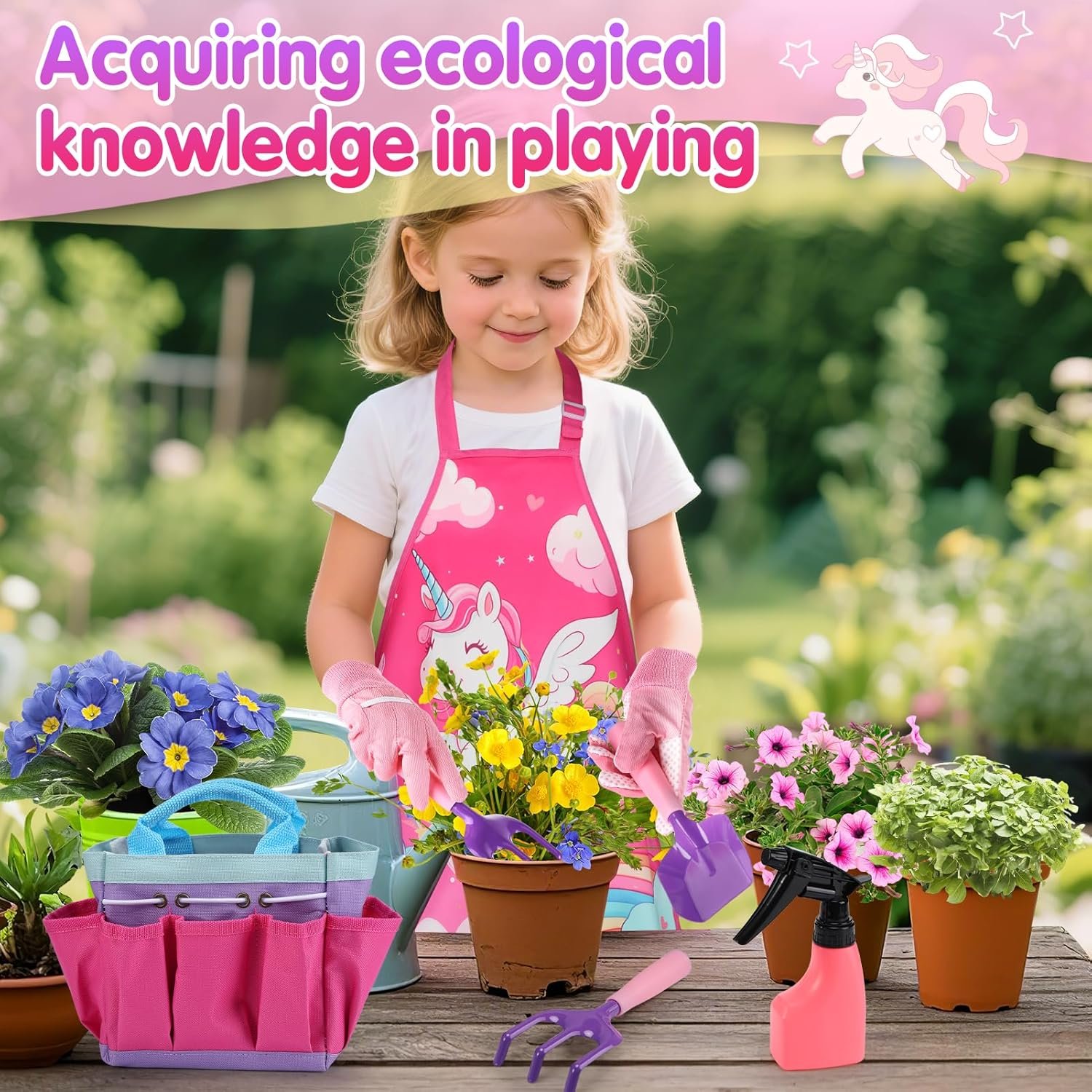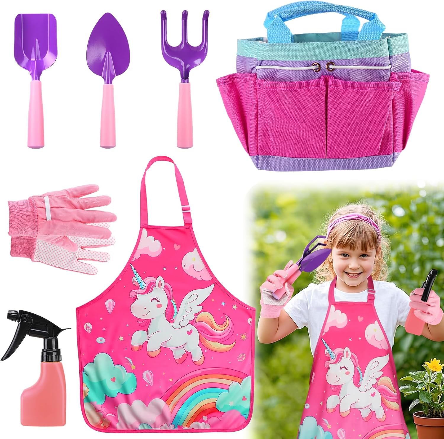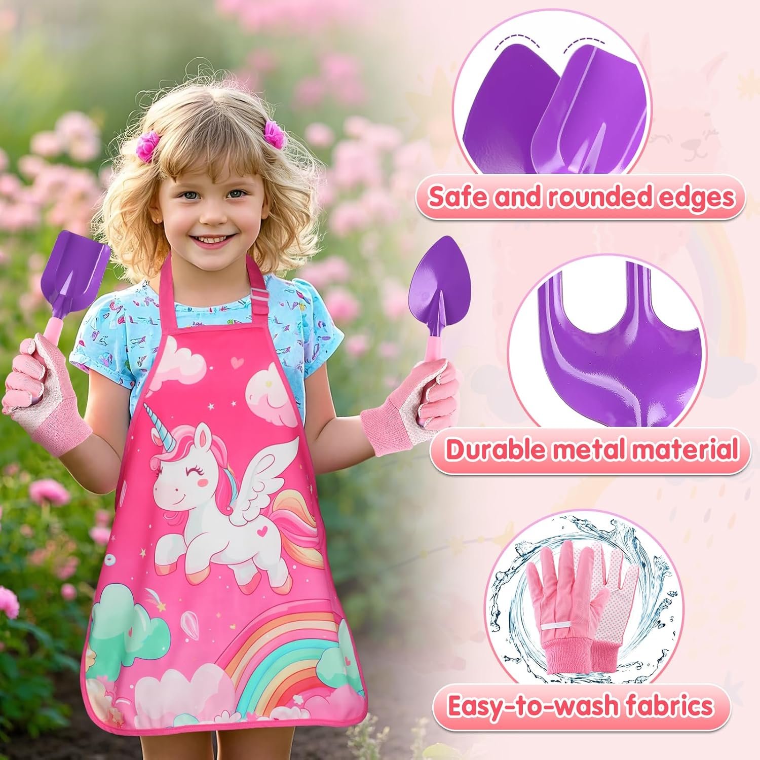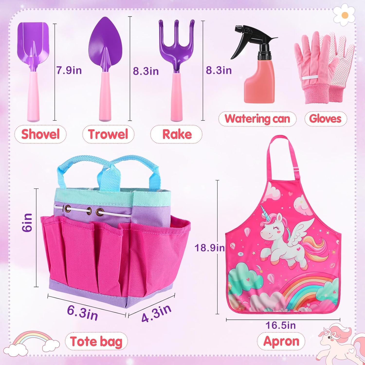 Kids Gardening Tool Set – Garden Tools for Kids with Shovel Trowel Rake Apron Gloves Watering Can and Tote Bag, Outdoor Toys Great Gifts for 3 4 5 6 7 8+ Years Old Girls (Unicorn Style)