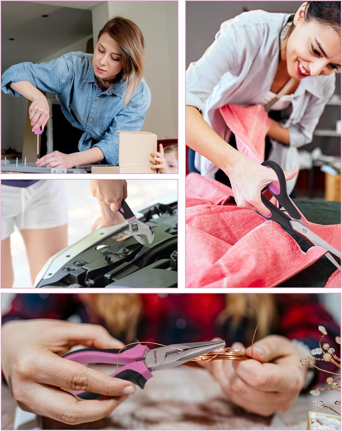 267PCS Home Reapir kit: This comprehensive 267-piece pink tool set is designed for daily DIY activities at home, containing all the practical tools you might need. It also comes with a 21V pink drill & tool bag, making it easy to handle both simple home repairs and complex renovation projects.